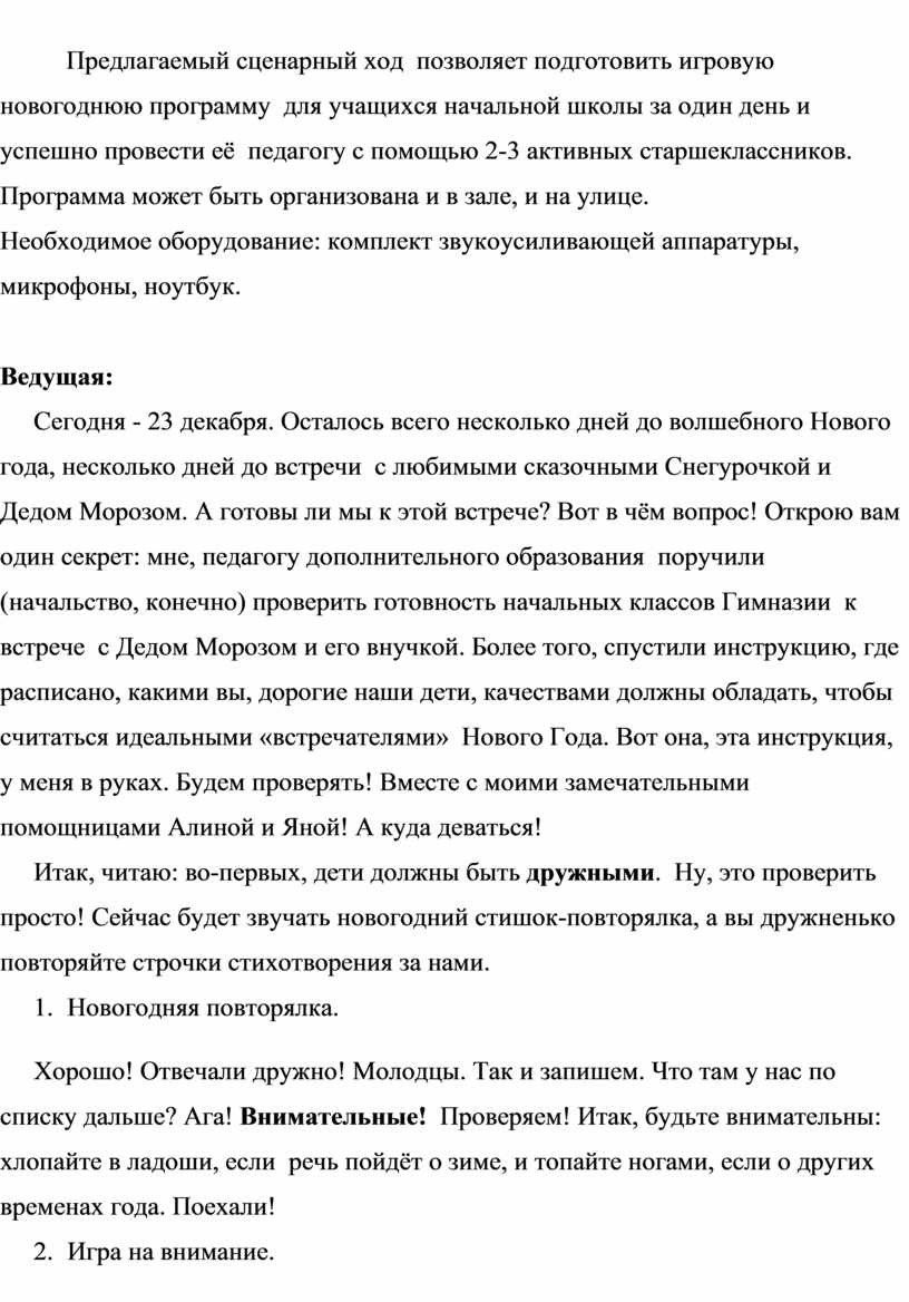 Предлагаемый сценарный ход позволяет подготовить игровую новогоднюю программу для учащихся начальной школы за один день и успешно провести её педагогу с помощью 2-3 активных старшеклассников. Программа может быть организована и в зале, и на улице.