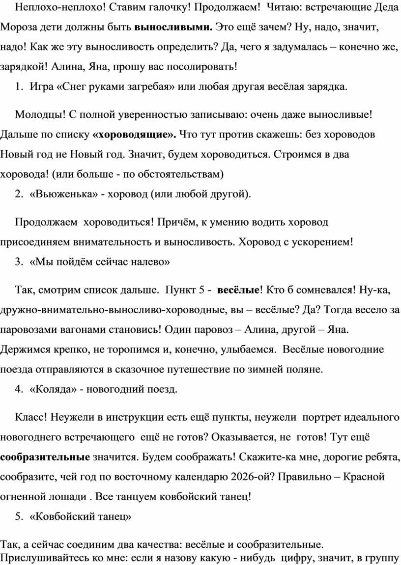 Класс! Неужели в инструкции есть ещё пункты, неужели портрет идеального новогоднего встречающего ещё не готов? Оказывается, не готов! Тут ещё сообразительные значится. Будем соображать! Скажите-ка мне, дорогие ребята, сообразите, чей год по восточному календарю 2026-ой? Правильно – Красной огненной лошади . Все танцуем ковбойский танец!