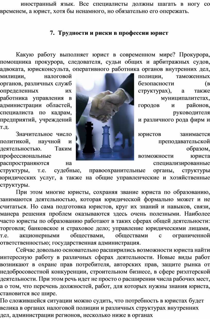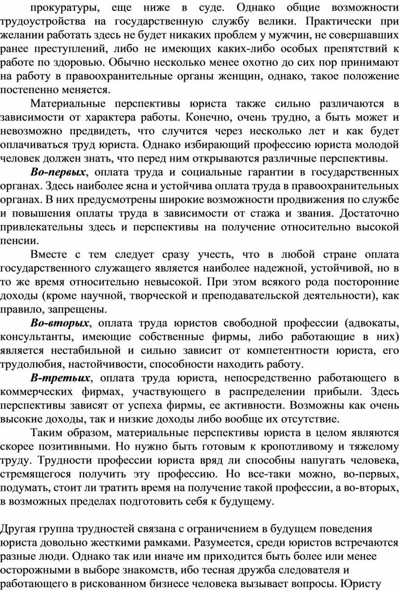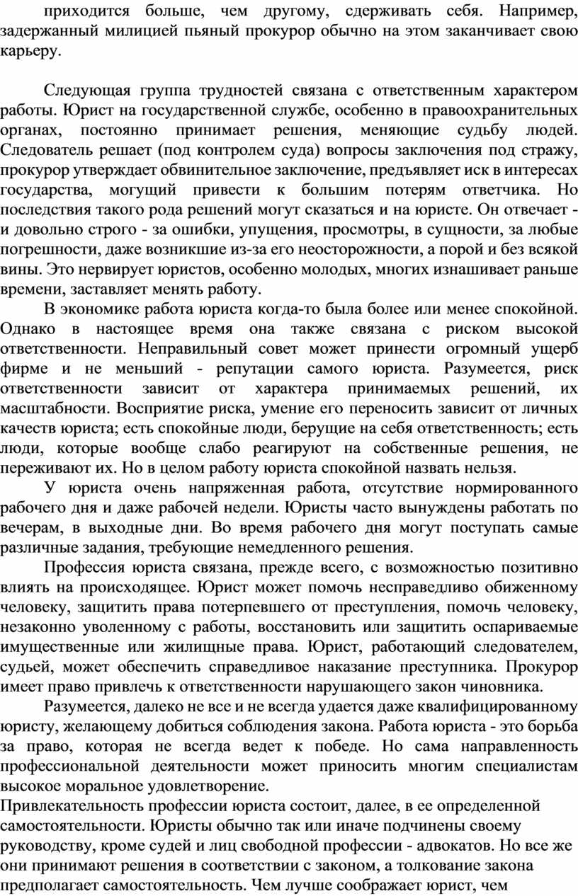 Таким образом, материальные перспективы юриста в целом являются скорее позитивными. Но нужно быть готовым к кропотливому и тяжелому труду. Трудности профессии юриста вряд ли способны напугать человека, стремящегося получить эту профессию. Но все-таки можно, во-первых, подумать, стоит ли тратить время на получение такой профессии, а во-вторых, в возможных пределах подготовить себя к будущему. Другая группа трудностей связана с ограничением в будущем поведения юриста довольно жесткими рамками. Разумеется, среди юристов встречаются разные люди. Однако так или иначе им приходится быть более или менее осторожными в выборе знакомств, ибо тесная дружба следователя и работающего в рискованном бизнесе человека вызывает вопросы. Юристу приходится больше, чем другому, сдерживать себя. Например, задержанный милицией пьяный прокурор обычно на этом заканчивает свою карьеру. Следующая группа трудностей связана с ответственным характером работы. Юрист на государственной службе, особенно в правоохранительных органах, постоянно принимает решения, меняющие судьбу людей. Следователь решает (под контролем суда) вопросы заключения под стражу, прокурор утверждает обвинительное заключение, предъявляет иск в интересах государства, могущий привести к большим потерям ответчика. Но последствия такого рода решений могут сказаться и на юристе. Он отвечает - и довольно строго - за ошибки, упущения, просмотры, в сущности, за любые погрешности, даже возникшие из-за его неосторожности, а порой и без всякой вины. Это нервирует юристов, особенно молодых, многих изнашивает раньше времени, заставляет менять работу.В экономике работа юриста когда-то была более или менее спокойной. Однако в настоящее время она также связана с риском высокой ответственности. Неправильный совет может принести огромный ущерб фирме и не меньший - репутации самого юриста. Разумеется, риск ответственности зависит от характера принимаемых решений, их масштабности. Восприятие риска, умение его переносить зависит от личных качеств юриста; есть спокойные люди, берущие на себя ответственность; есть люди, которые вообще слабо реагируют на собственные решения, не переживают их. Но в целом работу юриста спокойной назвать нельзя.У юриста очень напряженная работа, отсутствие нормированного рабочего дня и даже рабочей недели. Юристы часто вынуждены работать по вечерам, в выходные дни. Во время рабочего дня могут поступать самые различные задания, требующие немедленного решения.Профессия юриста связана, прежде всего, с возможностью позитивно влиять на происходящее. Юрист может помочь несправедливо обиженному человеку, защитить права потерпевшего от преступления, помочь человеку, незаконно уволенному с работы, восстановить или защитить оспариваемые имущественные или жилищные права. Юрист, работающий следователем, судьей, может обеспечить справедливое наказание преступника. Прокурор имеет право привлечь к ответственности нарушающего закон чиновника.Разумеется, далеко не все и не всегда удается даже квалифицированному юристу, желающему добиться соблюдения закона. Работа юриста - это борьба за право, которая не всегда ведет к победе. Но сама направленность профессиональной деятельности может приносить многим специалистам высокое моральное удовлетворение.Привлекательность п