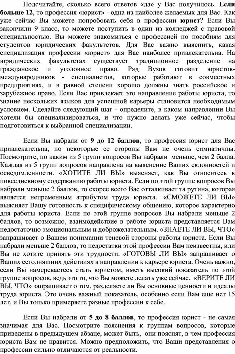 Подсчитайте, сколько всего ответов «да» у Вас получилось. Если больше 12, то профессия «юрист» - одна из наиболее желаемых для Вас. Как уже сейчас Вы можете попробовать себя в профессии юрист? Если Вы закончили 9 класс, то можете поступить в один из колледжей с правовой специальностью. Вы можете знакомиться с профессией по пособиям для студентов юридических факультетов. Для Вас важно выяснить, какая специализация профессии «юрист» для Вас наиболее привлекательна. На юридических факультетах существует традиционное разделение на гражданское и уголовное право. Ряд Вузов готовит юристов-международников - специалистов, которые работают в совместных предприятиях, и в равной степени хорошо должны знать российское и зарубежное право. Если Вас привлекает это направление работы юриста, то знание нескольких языков для успешной карьеры становится необходимым условием. Сделайте следующий шаг - определите, в каком направлении Вы хотели бы специализироваться, и что нужно делать уже сейчас, чтобы подготовиться к выбранной специализации.