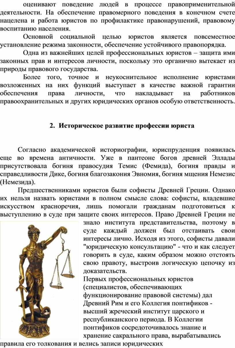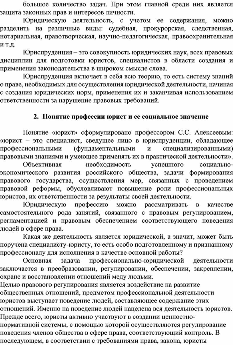 Понятие «юрист» сформулировано профессором С.С. Алексеевым: «юрист – это специалист, сведущее лицо в юриспруденции, обладающее профессиональными (фундаментальными и специализированными) правовыми знаниями и умеющее применять их в практической деятельности».Объективная необходимость успешного социально-экономического развития российского общества, задачи формирования правового государства, осуществления мер, связанных с проведением правовой реформы, обусловливают повышение роли профессиональных юристов, их ответственности за результаты своей деятельности.Юридическую профессию можно рассматривать в качестве самостоятельного рода занятий, связанного с правовым регулированием, регламентацией и правовым обеспечением соответствующего поведения людей в сфере права.Какая же деятельность является юридической, а значит, может быть поручена специалисту-юристу, то есть особо подготовленному и признанному профессионалу для исполнения в качестве основной работы?Основная задача профессионально-юридической деятельности заключается в преобразовании, регулировании, обеспечении, закреплении, охране и восстановлении отношений меду людьми.Целью правового регулирования является воздействие на развитие общественных отношений, предметом профессиональной деятельности юристов выступает поведение людей, составляющее содержание этих отношений. Именно на поведение людей нацелена вся деятельность юристов. Прежде всего, юристы активно участвуют в создании ценностно-нормативной системы, с помощью которой осуществляются регулирование поведения членов общества в сфере права, соответствующий контроль. В последующем, в соответствии с требованиями права, закона, юристы оценивают поведение людей в процессе правоприменительной деятельности. На обеспечение правомерного поведения в конечном счете нацелена и работа юристов по профилактике правонарушений, правовому воспитанию населения.Основной социальной целью юристов является повсеместное установление режима законности, обеспечение устойчивого правопорядка.Одна из важнейших целей профессиональных юристов – защита ими законных прав и интересов личности, поскольку это органично вытекает из природы правового государства.Более того, точное и неукоснительное исполнение юристами возложенных на них функций выступает в качестве важной гарантии обеспечения права личности, что накладывает на работников правоохранительных и других юридических органов особую ответственность. 3. Историческое развитие профессии юриста