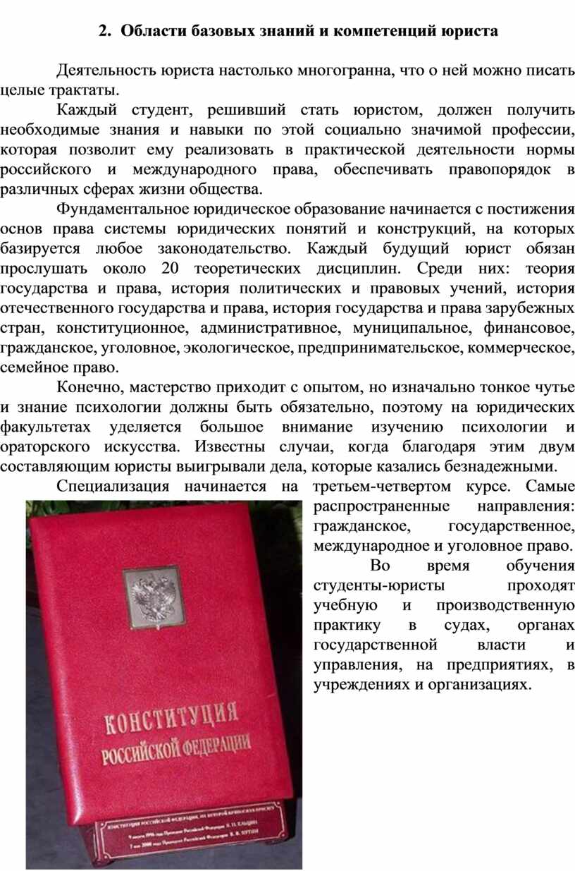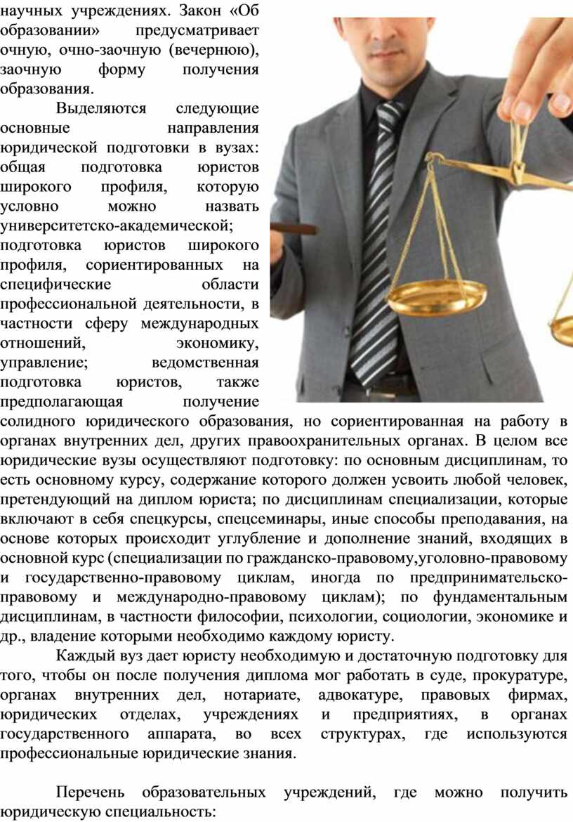 Деятельность юриста настолько многогранна, что о ней можно писать целые трактаты. Каждый студент, решивший стать юристом, должен получить необходимые знания и навыки по этой социально значимой профессии, которая позволит ему реализовать в практической деятельности нормы российского и международного права, обеспечивать правопорядок в различных сферах жизни общества.Фундаментальное юридическое образование начинается с постижения основ права системы юридических понятий и конструкций, на которых базируется любое законодательство. Каждый будущий юрист обязан прослушать около 20 теоретических дисциплин. Среди них: теория государства и права, история политических и правовых учений, история отечественного государства и права, история государства и права зарубежных стран, конституционное, административное, муниципальное, финансовое, гражданское, уголовное, экологическое, предпринимательское, коммерческое, семейное право.Конечно, мастерство приходит с опытом, но изначально тонкое чутье и знание психологии должны быть обязательно, поэтому на юридических факультетах уделяется большое внимание изучению психологии и ораторского искусства. Известны случаи, когда благодаря этим двум составляющим юристы выигрывали дела, которые казались безнадежными.Специализация начинается на третьем-четвертом курсе. Самые распространенные направления: гражданское, государственное, международное и уголовное право.Во время обучения студенты-юристы проходят учебную и производственную практику в судах, органах государственной власти и управления, на предприятиях, в учреждениях и организациях.Юристы всегда востребованы в нашей стране, они имеют интересную и перспективную работу. Вот уж у кого есть шанс испытать свой интеллект и продемонстрировать полученные умения и знания! Но в то же время профессиональный путь юриста тернист и долог. Зачастую приходится изучать тысячи документов, консультировать сотни людей, участвовать в сложных судопроизводственных процессах. Людям этой профессии нужна особая собранность и организованность, добросовестность и ответственность, поскольку судьба человека, его благополучие и процветание зависят от компетентности юриста. Юрист должен хорошо знать право, быть в куре изменений законодательства, так как людям часто бывает нужна «скорая неотложная помощь».
