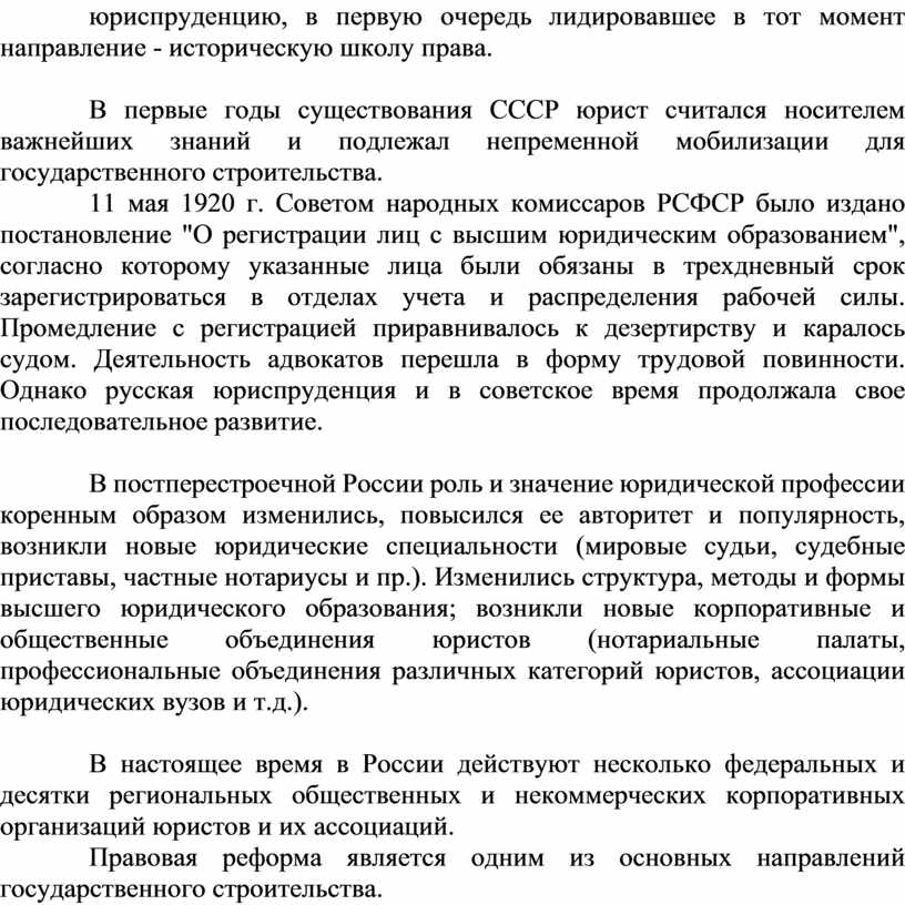 11 мая 1920 г. Советом народных комиссаров РСФСР было издано постановление "О регистрации лиц с высшим юридическим образованием", согласно которому указанные лица были обязаны в трехдневный срок зарегистрироваться в отделах учета и распределения рабочей силы. Промедление с регистрацией приравнивалось к дезертирству и каралось судом. Деятельность адвокатов перешла в форму трудовой повинности. Однако русская юриспруденция и в советское время продолжала свое последовательное развитие.