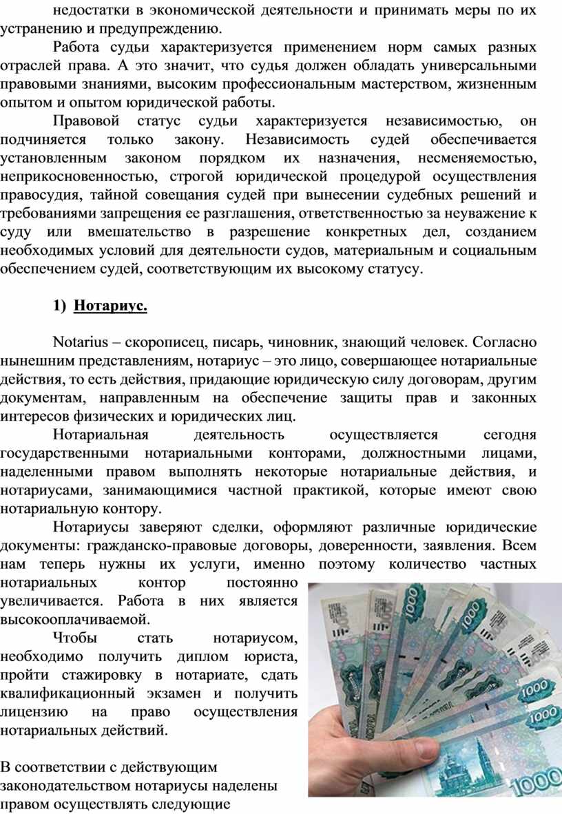 Судья арбитражного суда – должностное лицо, разрешающее в основном экономические споры. Он руководит рассмотрением экономического или иного спора, связанного с хозяйственной деятельностью, принимает решения по делу, обеспечивает защиту прав и законных интересов сторон. Судья арбитражного суда обязан выявлять нарушения законности, государственной и договорной дисциплины, недостатки в экономической деятельности и принимать меры по их устранению и предупреждению.Работа судьи характеризуется применением норм самых разных отраслей права. А это значит, что судья должен обладать универсальными правовыми знаниями, высоким профессиональным мастерством, жизненным опытом и опытом юридической работы.Правовой статус судьи характеризуется независимостью, он подчиняется только закону. Независимость судей обеспечивается установленным законом порядком их назначения, несменяемостью, неприкосновенностью, строгой юридической процедурой осуществления правосудия, тайной совещания судей при вынесении судебных решений и требованиями запрещения ее разглашения, ответственностью за неуважение к суду или вмешательство в разрешение конкретных дел, созданием необходимых условий для деятельности судов, материальным и социальным обеспечением судей, соответствующим их высокому статусу. 5) Нотариус.