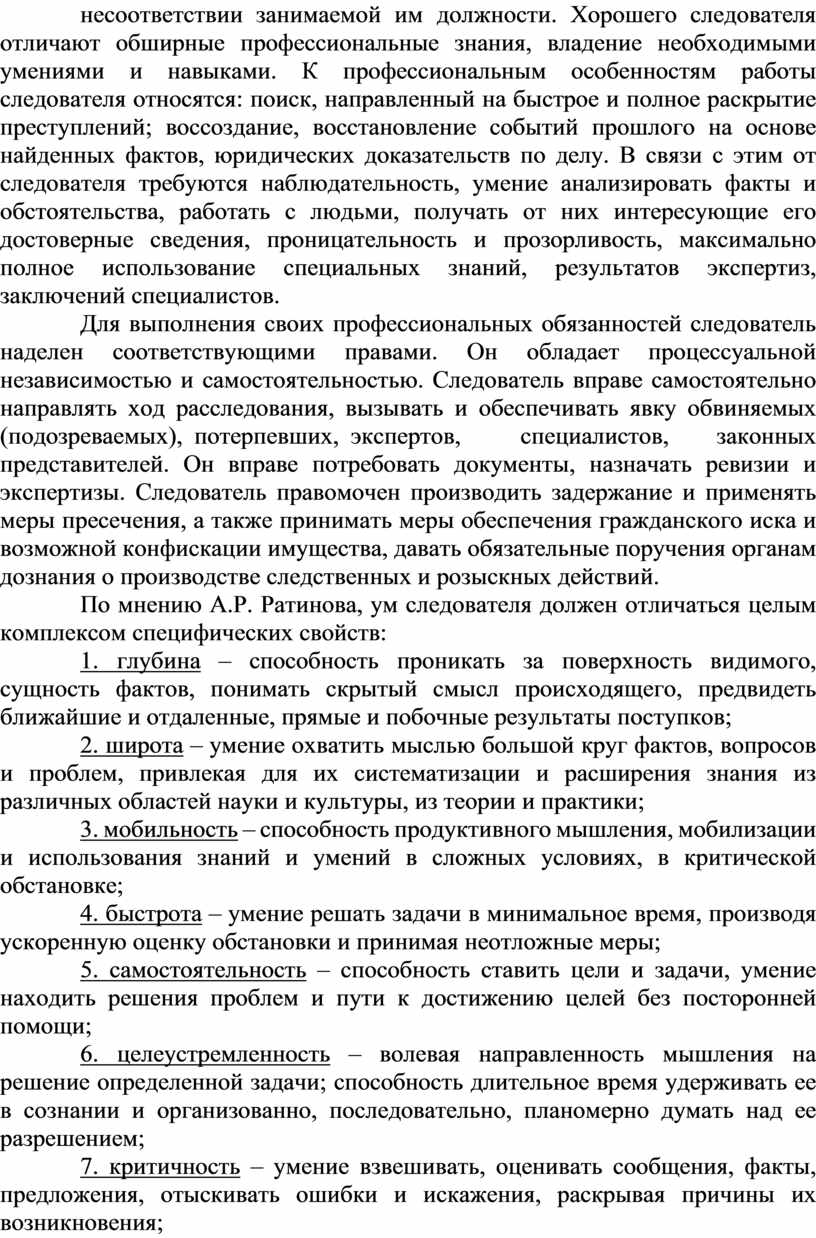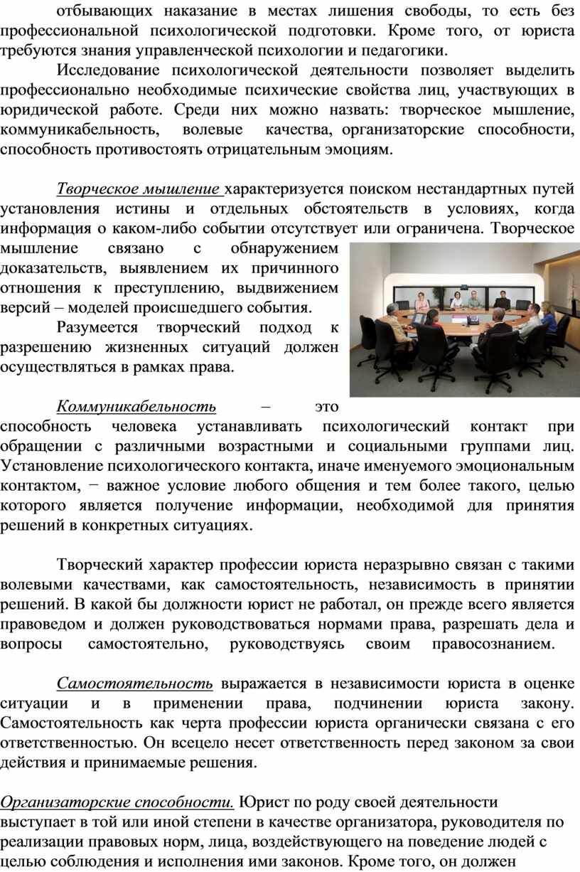 Немаловажное значение отводится психологическим особенностям деятельности юристов.Деятельность юриста связана с поведением людей в сфере общественных отношений. В связи с этим в его деятельности многое зависит от личностных качеств юриста, от педагогических способностей, от умения устанавливать и поддерживать контакты с людьми, от знания основ психологии, в частности, юридической психологии. Юридическую деятельность нельзя вести без знания психологии преступного поведения и личности преступника, судебной психологии и педагогики, психологии лиц, отбывающих наказание в местах лишения свободы, то есть без профессиональной психологической подготовки. Кроме того, от юриста требуются знания управленческой психологии и педагогики.Исследование психологической деятельности позволяет выделить профессионально необходимые психические свойства лиц, участвующих в юридической работе. Среди них можно назвать: творческое мышление, коммуникабельность, волевые качества, организаторские способности, способность противостоять отрицательным эмоциям. Творческое мышление характеризуется поиском нестандартных путей установления истины и отдельных обстоятельств в условиях, когда информация о каком-либо событии отсутствует или ограничена. Творческое мышление связано с обнаружением доказательств, выявлением их причинного отношения к преступлению, выдвижением версий – моделей происшедшего события.