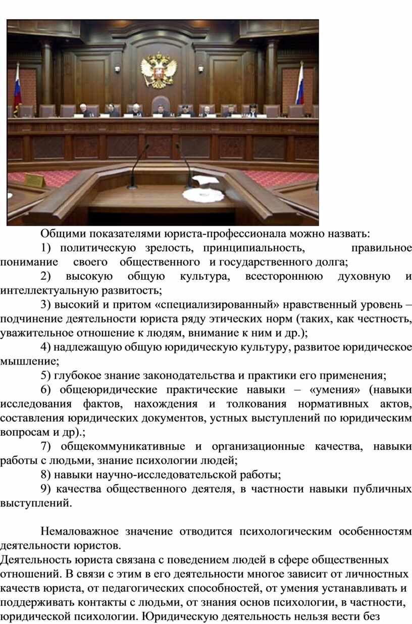 2) интеллектуально-мыслительные, к которым относятся общие профессиональные знания, способность решения мыслительных задач как типовых, так и нестандартных, способность к обучению, наблюдательность, способность концентрироваться на предмете познания, воспринимать информацию в процессе коммуникации и пр.; 3) психологические, к которым можно отнести развитость волевого начала, психологическую восприимчивость, правдивость, коммуникативность, самооценку, терпение, определенную степень мужества (как готовность противостоять реальным и мнимым угрозам) и пр.; 4) физические свойства, то есть возраст, состояние здоровья, утомляемость, некоторые индивидуальные физические свойства (зрение, подвижность и пр.) Общими показателями юриста-профессионала можно назвать:1) политическую зрелость, принципиальность, правильное понимание своего общественного и государственного долга;2) высокую общую культура, всестороннюю духовную и интеллектуальную развитость;3) высокий и притом «специализированный» нравственный уровень – подчинение деятельности юриста ряду этических норм (таких, как честность, уважительное отношение к людям, внимание к ним и др.);4) надлежащую общую юридическую культуру, развитое юридическое мышление;5) глубокое знание законодательства и практики его применения;6) общеюридические практические навыки – «умения» (навыки исследования фактов, нахождения и толкования нормативных актов, составления юридических документов, устных выступлений по юридическим вопросам и др).;7) общекоммуникативные и организационные качества, навыки работы с людьми, знание психологии людей;8) навыки научно-исследовательской работы;9) качества общественного деятеля, в частности навыки публичных выступлений.