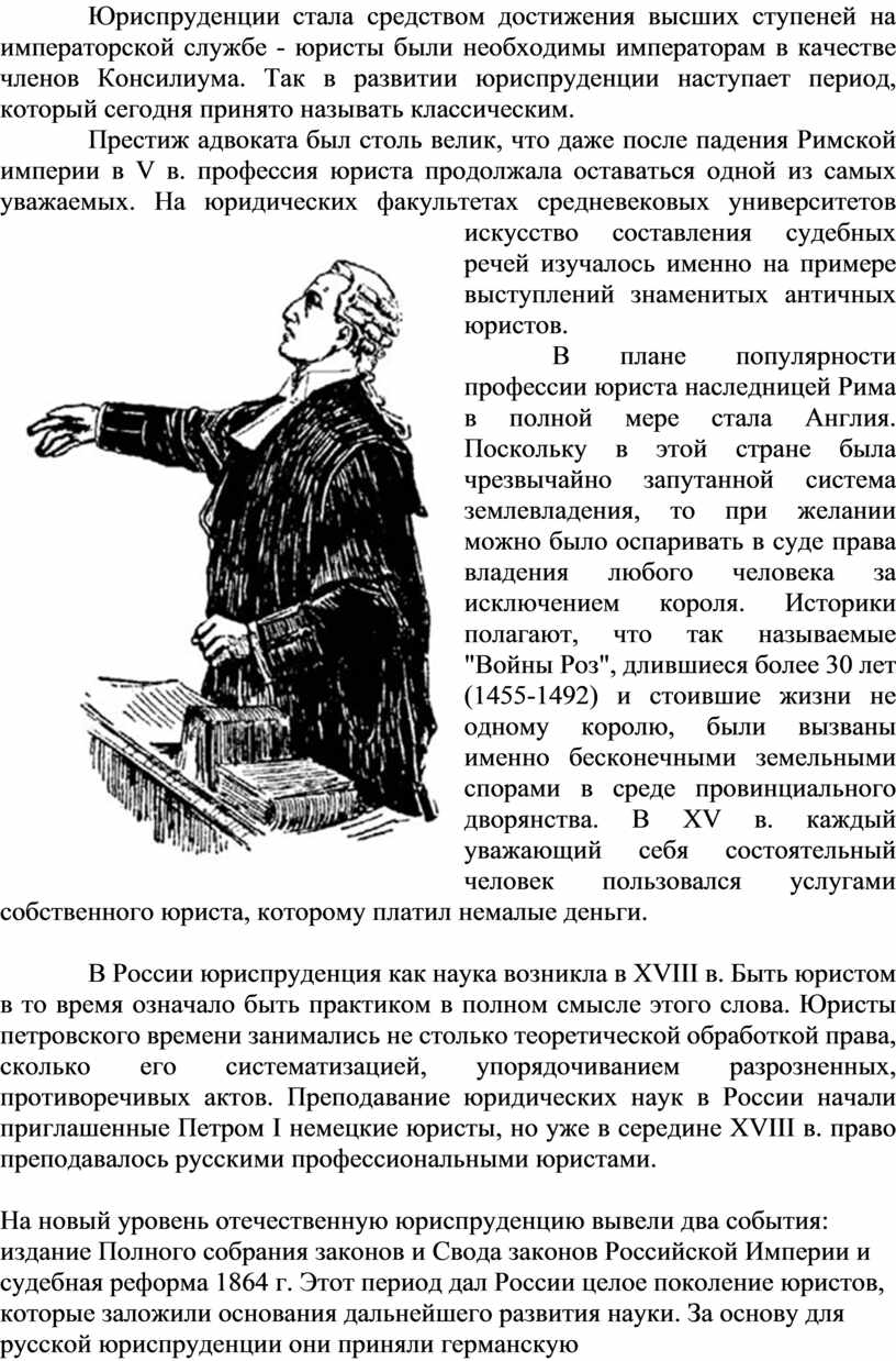 Юриспруденции стала средством достижения высших ступеней на императорской службе - юристы были необходимы императорам в качестве членов Консилиума. Так в развитии юриспруденции наступает период, который сегодня принято называть классическим.