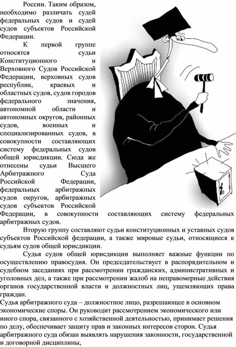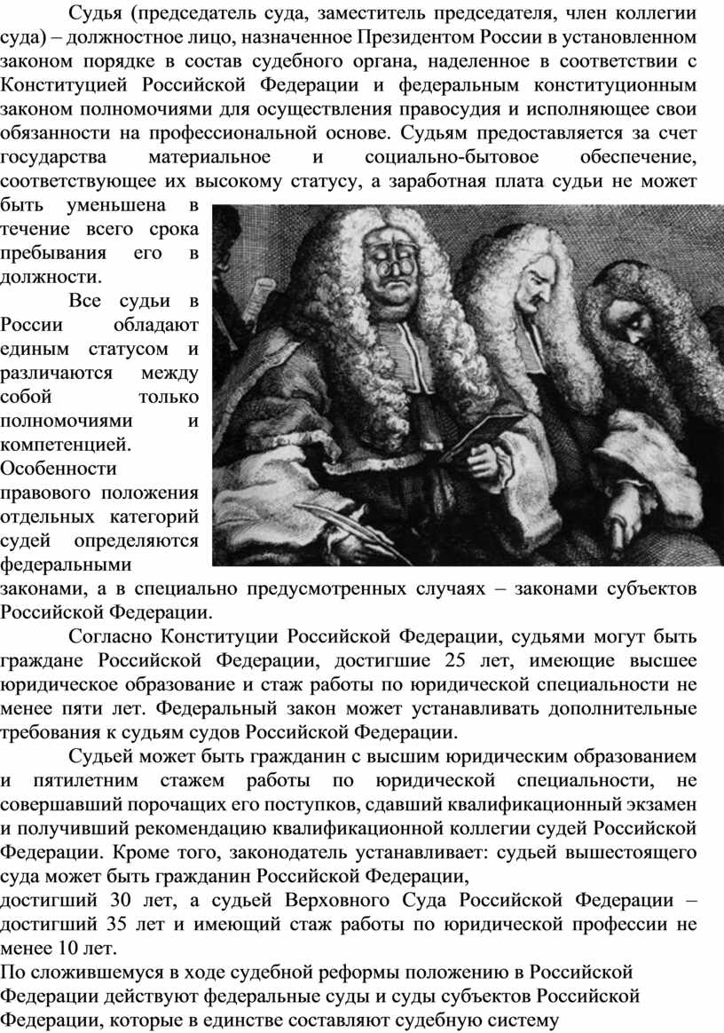 Все судьи в России обладают единым статусом и различаются между собой только полномочиями и компетенцией. Особенности правового положения отдельных категорий судей определяются федеральными законами, а в специально предусмотренных случаях – законами субъектов Российской Федерации.Согласно Конституции Российской Федерации, судьями могут быть граждане Российской Федерации, достигшие 25 лет, имеющие высшее юридическое образование и стаж работы по юридической специальности не менее пяти лет. Федеральный закон может устанавливать дополнительные требования к судьям судов Российской Федерации.Судьей может быть гражданин с высшим юридическим образованием и пятилетним стажем работы по юридической специальности, не совершавший порочащих его поступков, сдавший квалификационный экзамен и получивший рекомендацию квалификационной коллегии судей Российской Федерации. Кроме того, законодатель устанавливает: судьей вышестоящего суда может быть гражданин Российской Федерации,достигший 30 лет, а судьей Верховного Суда Российской Федерации – достигший 35 лет и имеющий стаж работы по юридической профессии не менее 10 лет.По сложившемуся в ходе судебной реформы положению в Российской Федерации действуют федеральные суды и суды субъектов Российской Федерации, которые в единстве составляют судебную систему России. Таким образом, необходимо различать судей федеральных судов и судей судов субъектов Российской Федерации.К первой группе относятся судьи Конституционного и Верховного Судов Российской Федерации, верховных судов республик, краевых и областных судов, судов городов федерального значения, автономной области и автономных округов, районных судов, военных и специализированных судов, в совокупности составляющих систему федеральных судов общей юрисдикции. Сюда же отнесены судьи Высшего Арбитражного Суда Российской Федерации, федеральных арбитражных судов округов, арбитражных судов субъектов Российской Федерации, в совокупности составляющих систему федеральных арбитражных судов.Вторую группу составляют судьи конституционных и уставных судов субъектов Российской федерации, а также мировые судьи, относящиеся к судьям судов общей юрисдикции.Судья судов общей юрисдикции выполняет важные функции по осуществлению правосудия. Он председательствует в распорядительном и судебном заседаниях при рассмотрении гражданских, административных и уголовных дел, а также при рассмотрении жалоб на неправомерные действия органов государственной власти и должностных лиц, ущемляющих права граждан.