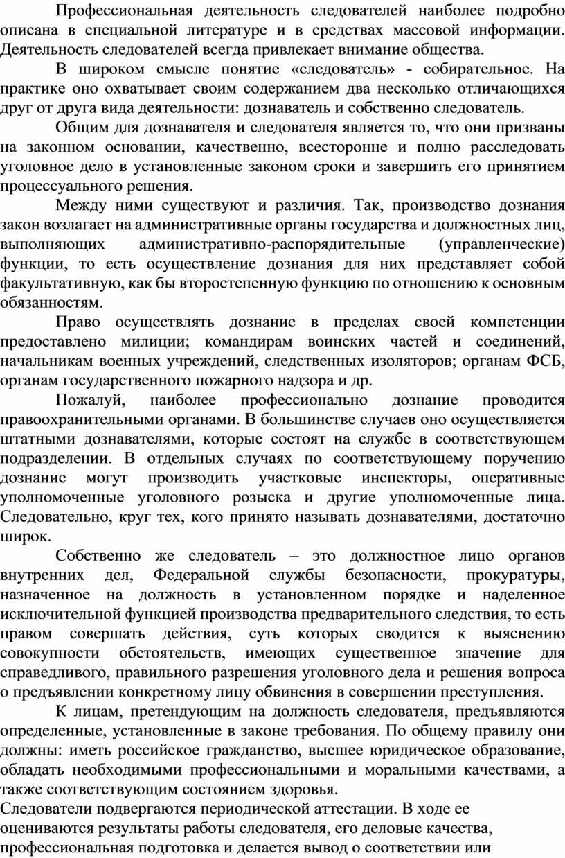 Профессиональная деятельность следователей наиболее подробно описана в специальной литературе и в средствах массовой информации. Деятельность следователей всегда привлекает внимание общества.В широком смысле понятие «следователь» - собирательное. На практике оно охватывает своим содержанием два несколько отличающихся друг от друга вида деятельности: дознаватель и собственно следователь.Общим для дознавателя и следователя является то, что они призваны на законном основании, качественно, всесторонне и полно расследовать уголовное дело в установленные законом сроки и завершить его принятием процессуального решения.Между ними существуют и различия. Так, производство дознания закон возлагает на административные органы государства и должностных лиц, выполняющих административно-распорядительные (управленческие) функции, то есть осуществление дознания для них представляет собой факультативную, как бы второстепенную функцию по отношению к основным обязанностям.Право осуществлять дознание в пределах своей компетенции предоставлено милиции; командирам воинских частей и соединений, начальникам военных учреждений, следственных изоляторов; органам ФСБ, органам государственного пожарного надзора и др.Пожалуй, наиболее профессионально дознание проводится правоохранительными органами. В большинстве случаев оно осуществляется штатными дознавателями, которые состоят на службе в соответствующем подразделении. В отдельных случаях по соответствующему поручению дознание могут производить участковые инспекторы, оперативные уполномоченные уголовного розыска и другие уполномоченные лица. Следовательно, круг тех, кого принято называть дознавателями, достаточно широк.Собственно же следователь – это должностное лицо органов внутренних дел, Федеральной службы безопасности, прокуратуры, назначенное на должность в установленном порядке и наделенное исключительной функцией производства предварительного следствия, то есть правом совершать действия, суть которых сводится к выяснению совокупности обстоятельств, имеющих существенное значение для справедливого, правильного разрешения уголовного дела и решения вопроса о предъявлении конкретному лицу обвинения в совершении преступления.К лицам, претендующим на должность следователя, предъявляются определенные, установленные в законе требования. По общему правилу они должны: иметь российское гражданство, высшее юридическое образование, обладать необходимыми профессиональными и моральными качествами, а также соответствующим состоянием здоровья.Следователи подвергаются периодической аттестации. В ходе ее оцениваются результаты работы следователя, его деловые качества, профессиональная подготовка и делается вывод о соответствии или несоответствии занимаемой им должности. Хорошего следователя отличают обширные профессиональные знания, владение необходимыми умениями и навыками. К профессиональным особенностям работы следователя относятся: поиск, направленный на быстрое и полное раскрытие преступлений; воссоздание, восстановление событий прошлого на основе найденных фактов, юридических доказательств по делу. В связи с этим от следователя требуются наблюдательность, умение анализировать факты и обстоятельства, работать с людьми, получать от них интер