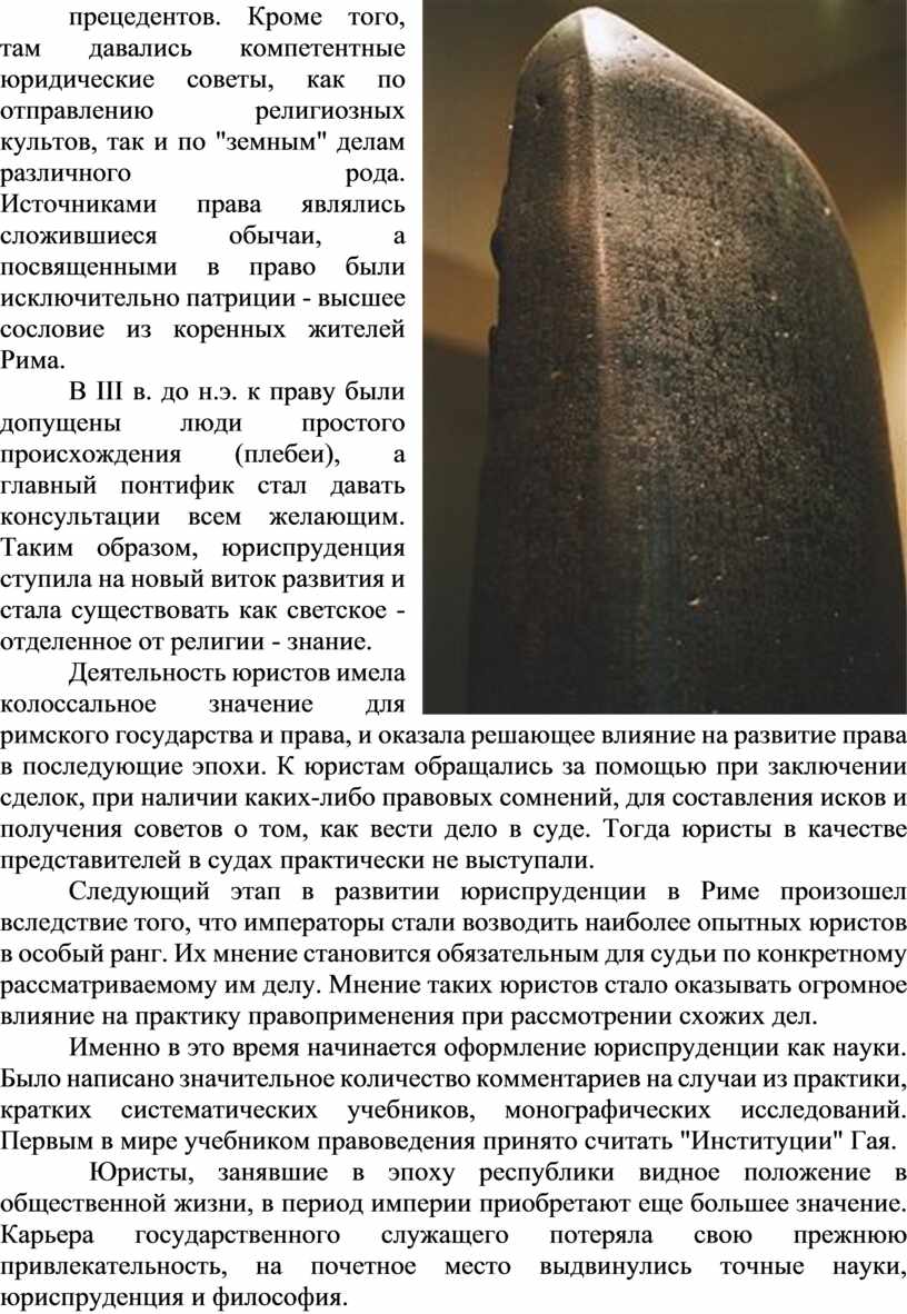 В III в. до н.э. к праву были допущены люди простого происхождения (плебеи), а главный понтифик стал давать консультации всем желающим. Таким образом, юриспруденция ступила на новый виток развития и стала существовать как светское - отделенное от религии - знание.