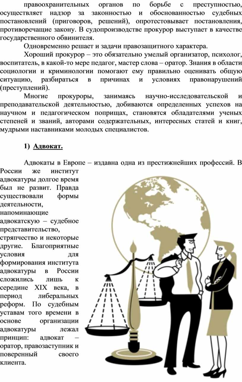 Адвокаты в Европе – издавна одна из престижнейших профессий. В России же институт адвокатуры долгое время был не развит. Правда существовали формы деятельности, напоминающие адвокатскую – судебное представительство, стряпчество и некоторые другие. Благоприятные условия для формирования института адвокатуры в России сложились лишь к середине XIX века, в период либеральных реформ. По судебным уставам того времени в основе организации адвокатуры лежал принцип: адвокат – оратор, правозаступник и поверенный своего клиента.Адвокатура представляет собой негосударственное и некоммерческое профессиональное объединение юристов, созданное для оказания юридической помощи физическим и юридическим лицам в целях защиты их прав и законных интересов. Сегодня адвокат – это лицо, имеющее высшее юридическое образование и стаж работы по специальности не менее двух лет, сдавшее квалификационные экзамены и принятое в одну из коллегий адвокатов. Те, кто окончили юридические вузы и не имеют стажа работы, либо имеют менее чем двухлетний стаж, принимаются в коллегии лишь после прохождения соответствующей стажировки от шести месяцев до года.Адвокаты – высококвалифицированные юристы достаточно широкого профиля, но чаще всего они предпочитают специализацию в конкретной области права, например, в гражданском, уголовном праве.Содержание адвокатской деятельности составляет юридическая помощь различных видов и форм, оказываемая физическим и юридическим лицам, а именно: устные и письменные консультации; справки по правовым вопросам; составление заявлений, жалоб, ходатайств, письменных заключений и других документов правового характера; участие в качестве представителя сторон в различных видах судопроизводства; оказание иной не запрещенной законом юридической помощи (разработка уставов и подготовка к регистрации юридических лиц, правовое обслуживание коммерческих операций, заключение контрактов, правовой контроль за учетом и отчетностью и др.). В силу этого адвокат вступает в различные отношения, связанные с комплексом обязательств юридического и морального характера: перед клиентом, а также перед судом и другими органами публичной власти, с которыми он контактирует, выступая в качестве доверенного лица клиента или от его имени; перед коллегами (адвокатами), представителями других юридических специальностей; перед обществом в целом, для членов которого существование свободной профессии адвоката, наряду с соблюдением норм права, является важнейшей гарантией защиты прав человека от любых источников произвола.