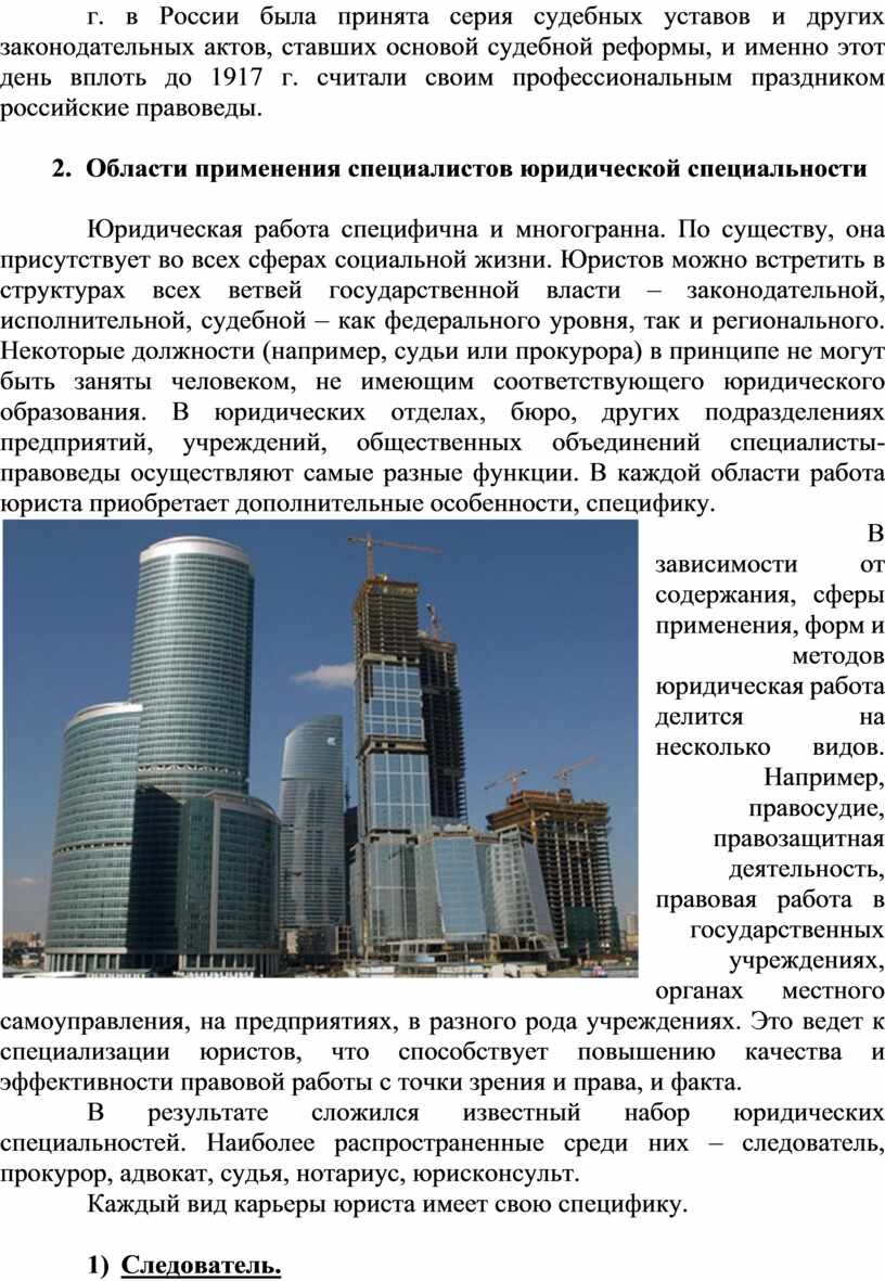 Юридическая работа специфична и многогранна. По существу, она присутствует во всех сферах социальной жизни. Юристов можно встретить в структурах всех ветвей государственной власти – законодательной, исполнительной, судебной – как федерального уровня, так и регионального. Некоторые должности (например, судьи или прокурора) в принципе не могут быть заняты человеком, не имеющим соответствующего юридического образования. В юридических отделах, бюро, других подразделениях предприятий, учреждений, общественных объединений специалисты-правоведы осуществляют самые разные функции. В каждой области работа юриста приобретает дополнительные особенности, специфику.