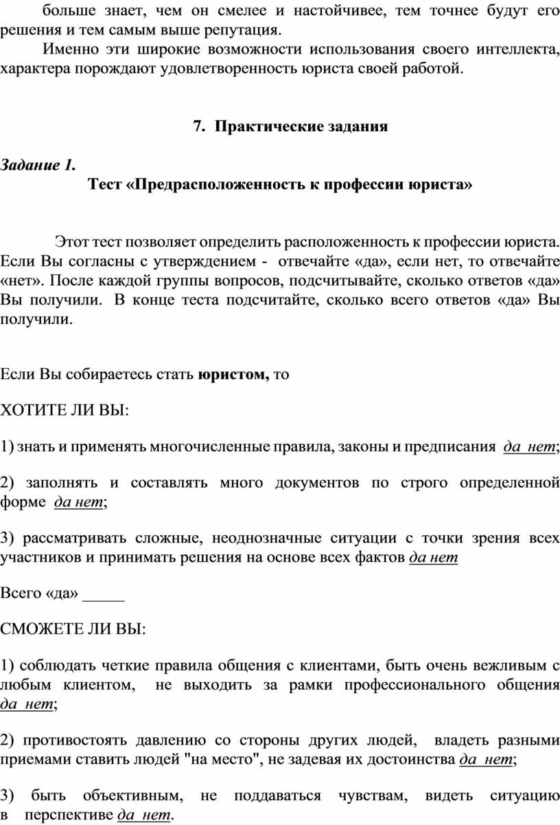 Этот тест позволяет определить расположенность к профессии юриста. Если Вы согласны с утверждением - отвечайте «да», если нет, то отвечайте «нет». После каждой группы вопросов, подсчитывайте, сколько ответов «да» Вы получили. В конце теста подсчитайте, сколько всего ответов «да» Вы получили.
