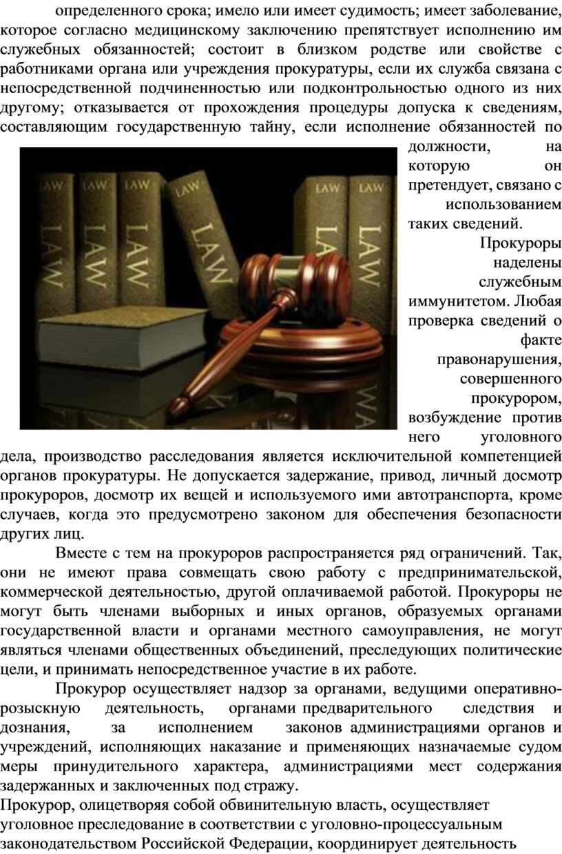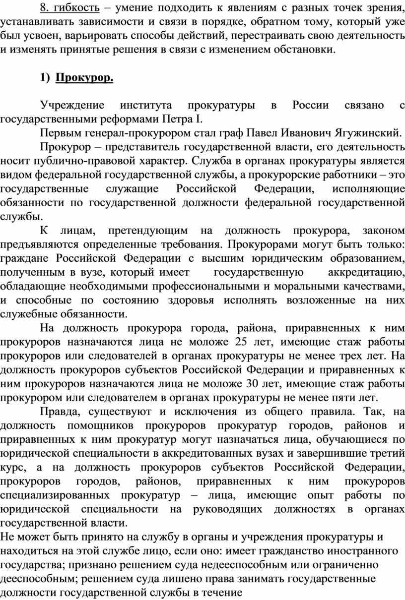 Учреждение института прокуратуры в России связано с государственными реформами Петра I.Первым генерал-прокурором стал граф Павел Иванович Ягужинский.Прокурор – представитель государственной власти, его деятельность носит публично-правовой характер. Служба в органах прокуратуры является видом федеральной государственной службы, а прокурорские работники – это государственные служащие Российской Федерации, исполняющие обязанности по государственной должности федеральной государственной службы.К лицам, претендующим на должность прокурора, законом предъявляются определенные требования. Прокурорами могут быть только: граждане Российской Федерации с высшим юридическим образованием, полученным в вузе, который имеет государственную аккредитацию, обладающие необходимыми профессиональными и моральными качествами, и способные по состоянию здоровья исполнять возложенные на них служебные обязанности.На должность прокурора города, района, приравненных к ним прокуроров назначаются лица не моложе 25 лет, имеющие стаж работы прокуроров или следователей в органах прокуратуры не менее трех лет. На должность прокуроров субъектов Российской Федерации и приравненных к ним прокуроров назначаются лица не моложе 30 лет, имеющие стаж работы прокурором или следователем в органах прокуратуры не менее пяти лет.Правда, существуют и исключения из общего правила. Так, на должность помощников прокуроров прокуратур городов, районов и приравненных к ним прокуратур могут назначаться лица, обучающиеся по юридической специальности в аккредитованных вузах и завершившие третий курс, а на должность прокуроров субъектов Российской Федерации, прокуроров городов, районов, приравненных к ним прокуроров специализированных прокуратур – лица, имеющие опыт работы по юридической специальности на руководящих должностях в органах государственной власти.Не может быть принято на службу в органы и учреждения прокуратуры и находиться на этой службе лицо, если оно: имеет гражданство иностранного государства; признано решением суда недееспособным или ограниченно дееспособным; решением суда лишено права занимать государственные должности государственной службы в течение определенного срока; имело или имеет судимость; имеет заболевание, которое согласно медицинскому заключению препятствует исполнению им служебных обязанностей; состоит в близком родстве или свойстве с работниками органа или учреждения прокуратуры, если их служба связана с непосредственной подчиненностью или подконтрольностью одного из них другому; отказывается от прохождения процедуры допуска к сведениям, составляющим государственную тайну, если исполнение обязанностей по должности, на которую он претендует, связано с использованием таких сведений.Прокуроры наделены служебным иммунитетом. Любая проверка сведений о факте правонарушения, совершенного прокурором, возбуждение против него уголовного дела, производство расследования является исключительной компетенцией органов прокуратуры. Не допускается задержание, привод, личный досмотр прокуроров, досмотр их вещей и используемого ими автотранспорта, кроме случаев, когда это предусмотрено законом для обеспечения безопасности других лиц.Вместе с тем на прокуроров распространяется ряд ограничений. Так, они не имеют