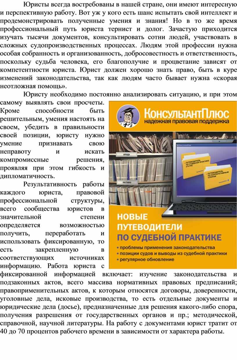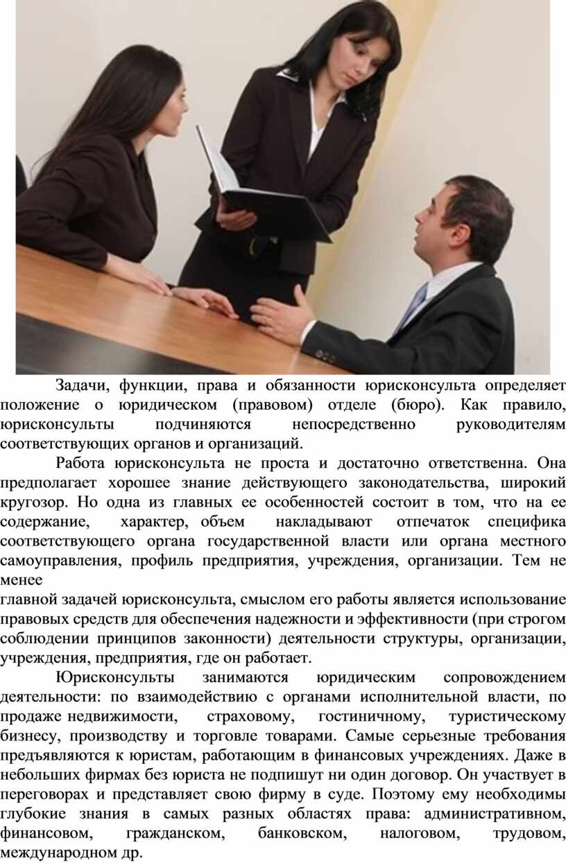 Работа юрисконсульта не проста и достаточно ответственна. Она предполагает хорошее знание действующего законодательства, широкий кругозор. Но одна из главных ее особенностей состоит в том, что на ее содержание, характер, объем накладывают отпечаток специфика соответствующего органа государственной власти или органа местного самоуправления, профиль предприятия, учреждения, организации. Тем не менееглавной задачей юрисконсульта, смыслом его работы является использование правовых средств для обеспечения надежности и эффективности (при строгом соблюдении принципов законности) деятельности структуры, организации, учреждения, предприятия, где он работает.Юрисконсульты занимаются юридическим сопровождением деятельности: по взаимодействию с органами исполнительной власти, по продаже недвижимости, страховому, гостиничному, туристическому бизнесу, производству и торговле товарами. Самые серьезные требования предъявляются к юристам, работающим в финансовых учреждениях. Даже в небольших фирмах без юриста не подпишут ни один договор. Он участвует в переговорах и представляет свою фирму в суде. Поэтому ему необходимы глубокие знания в самых разных областях права: административном, финансовом, гражданском, банковском, налоговом, трудовом, международном др.5. Области базовых знаний и компетенций юриста