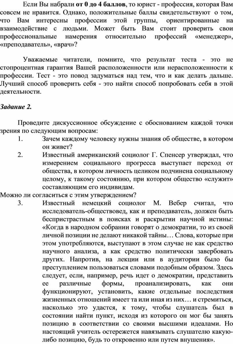 3. Известный немецкий социолог М. Вебер считал, что исследователь-обществовед, как и преподаватель, должен быть беспристрастным в поисках и раскрытии научной истины: «Когда в народном собрании говорят о демократии, то из своей личной позиции не делают никакой тайны… Слова, которые при этом употребляются, выступают в этом случае не как средство научного анализа, а как средство политически завербовать других. Напротив, на лекции или в аудитории было бы преступлением пользоваться словами подобным образом. Здесь следует, если, например, речь идет о демократии, представить ее различные формы, проанализировать, как они функционируют, установить, какие отдельные последствия жизненных отношений имеет та или иная из них… и стремиться, насколько это удастся, к тому, чтобы слушатель был в состоянии найти пункт, исходя из которого он мог бы занять позицию в соответствии со своими высшими идеалами. Но настоящий учитель остережется навязывать слушателю какую-либо позицию, будь то откровенно или путем внушения».