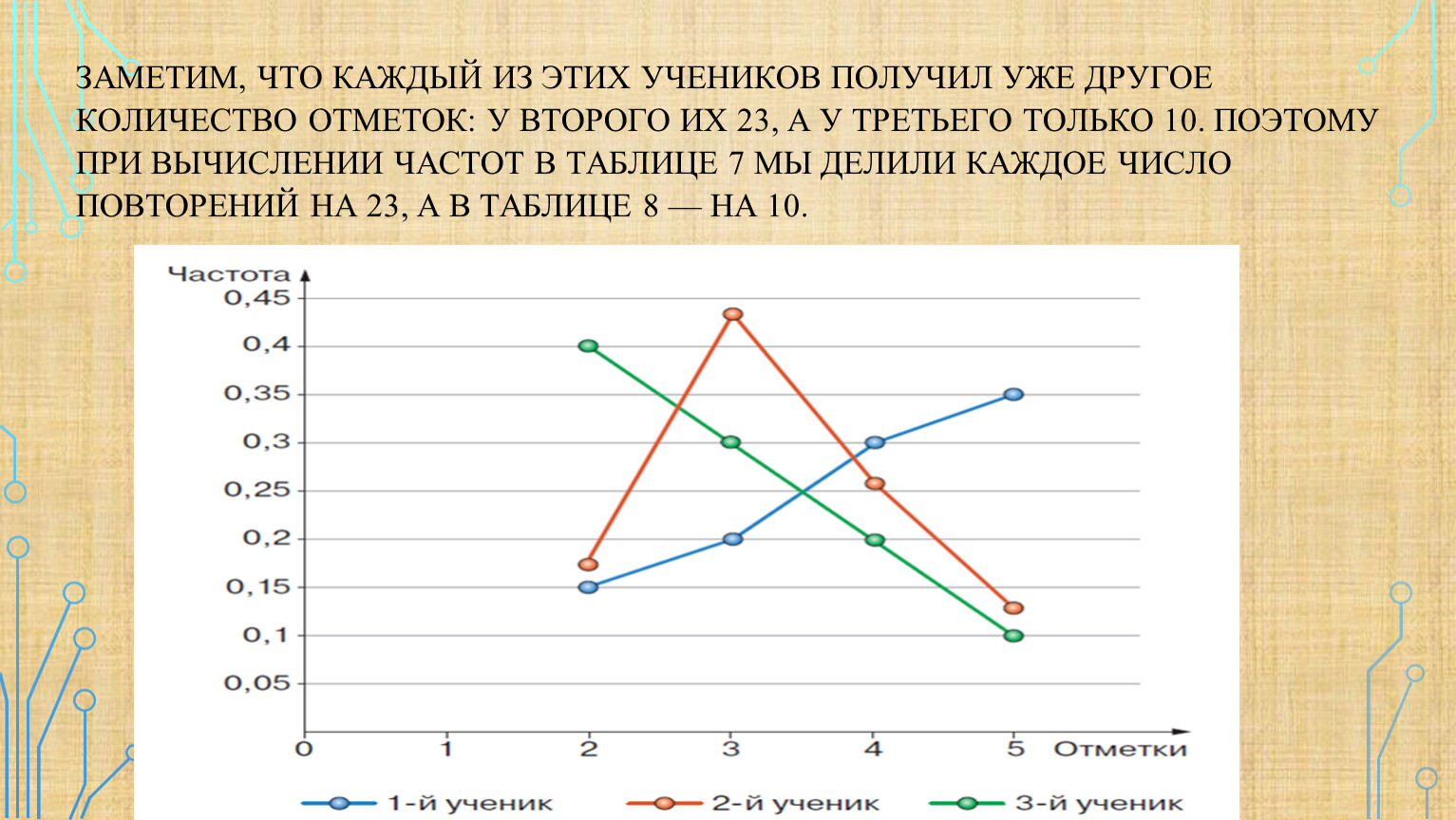 Заметим, что каждый из этих учеников получил уже другое количество отметок: у второго их 23, а у третьего только 10. Поэтому при вычислении частот в таблице 7 мы делили каждое число повторений на 23, а в таблице 8 — на 10.