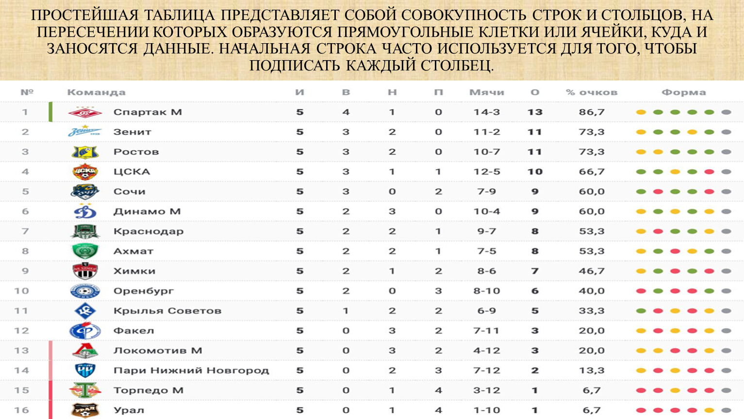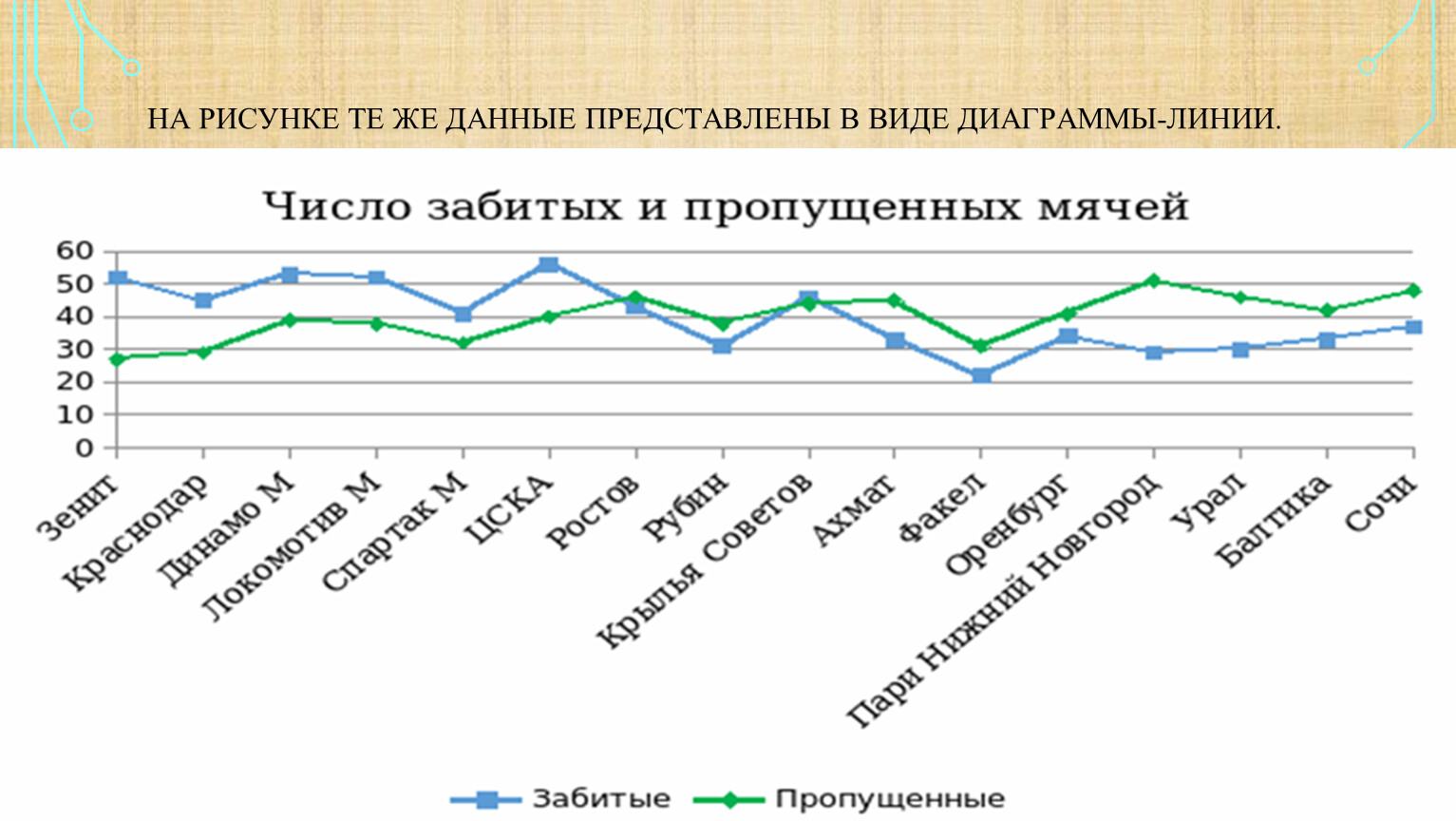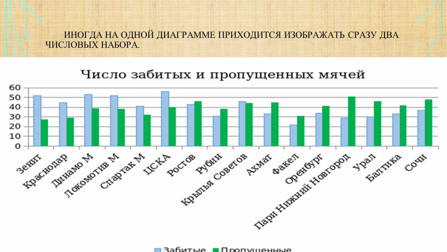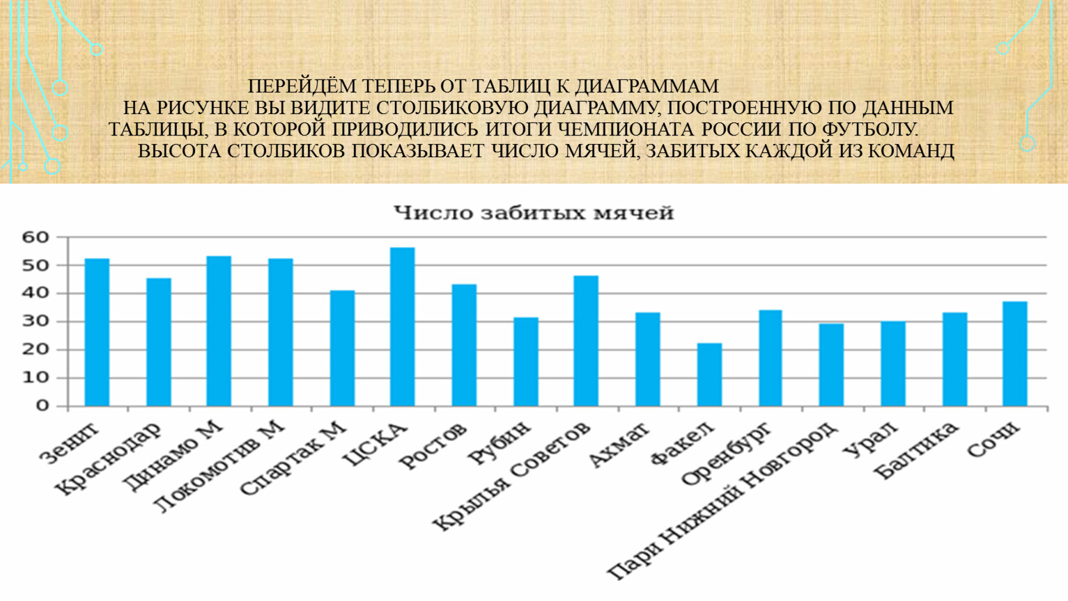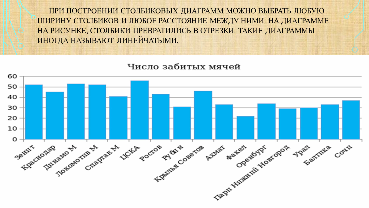 Перейдём теперь от таблиц к диаграммам На рисунке вы видите столбиковую диаграмму, построенную по данным таблицы, в которой приводились итоги чемпионата России по футболу. Высота столбиков показывает число мячей, забитых каждой из команд