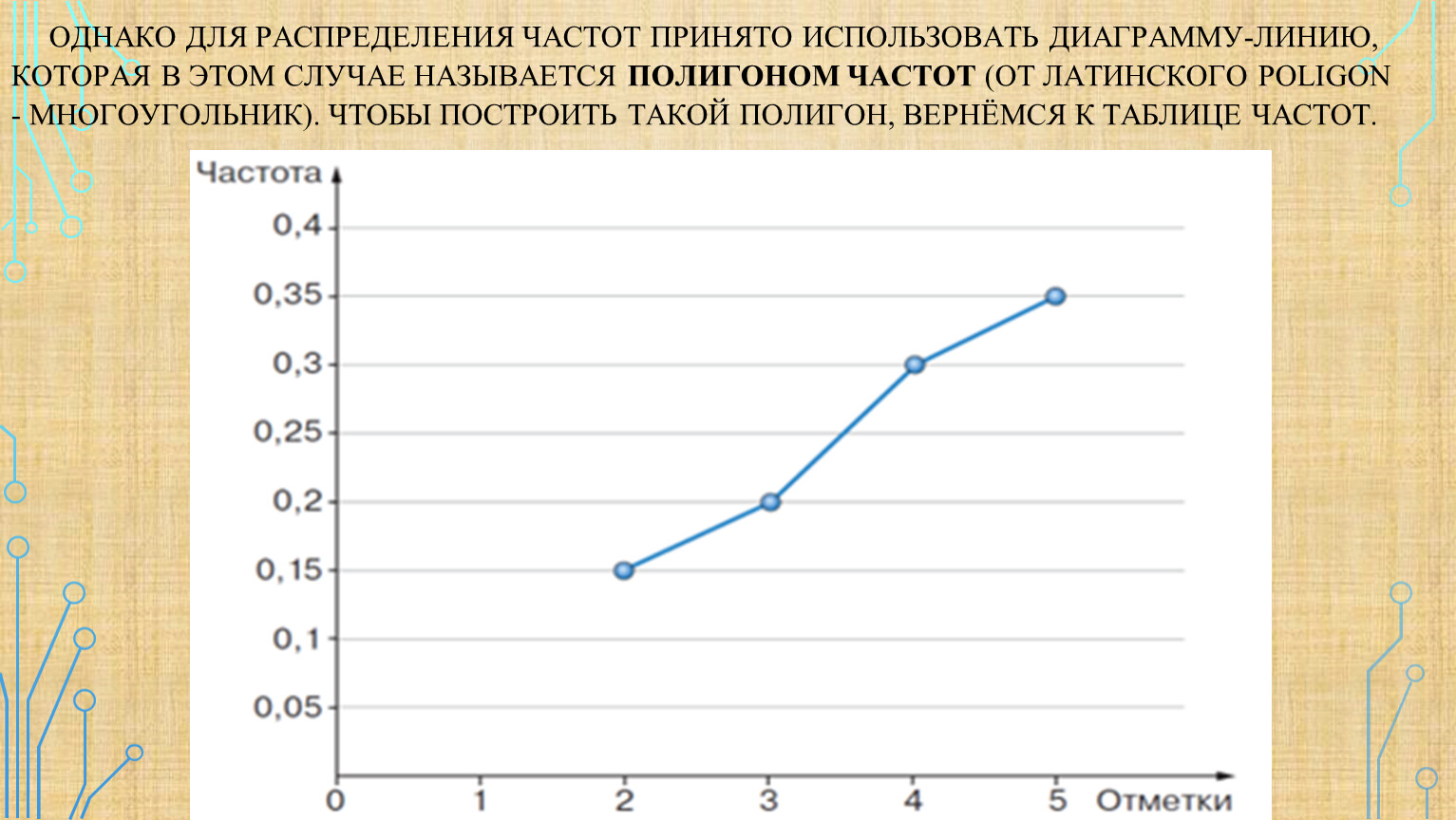 Однако для распределения частот принято использовать диаграмму-линию, которая в этом случае называется полигоном частот (от латинского poligon - многоугольник). Чтобы построить такой полигон, вернёмся к таблице частот.
