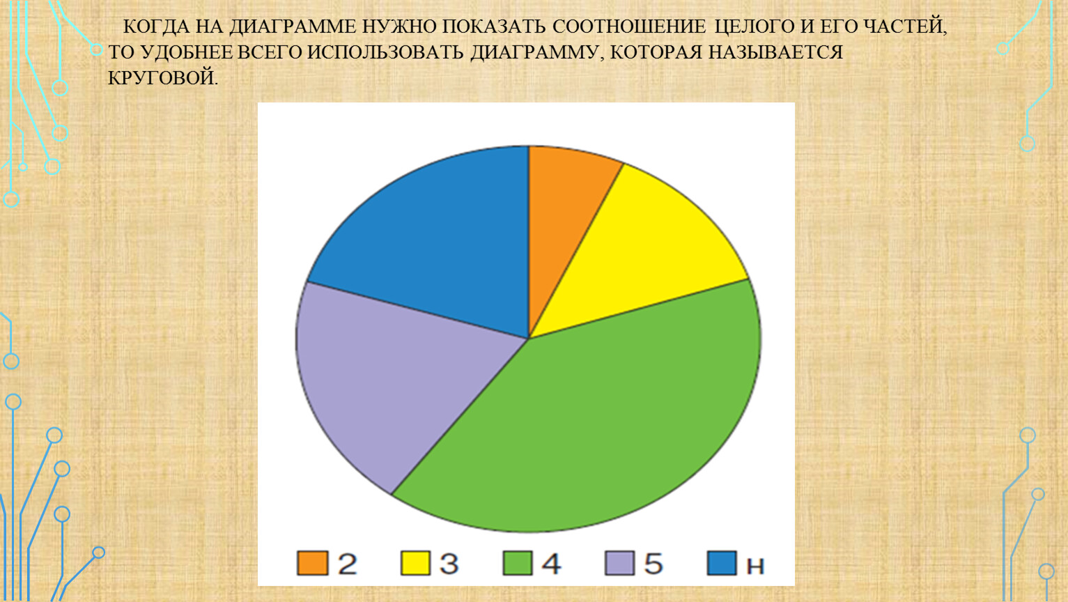 Когда на диаграмме нужно показать соотношение целого и его частей, то удобнее всего использовать диаграмму, которая называется круговой.