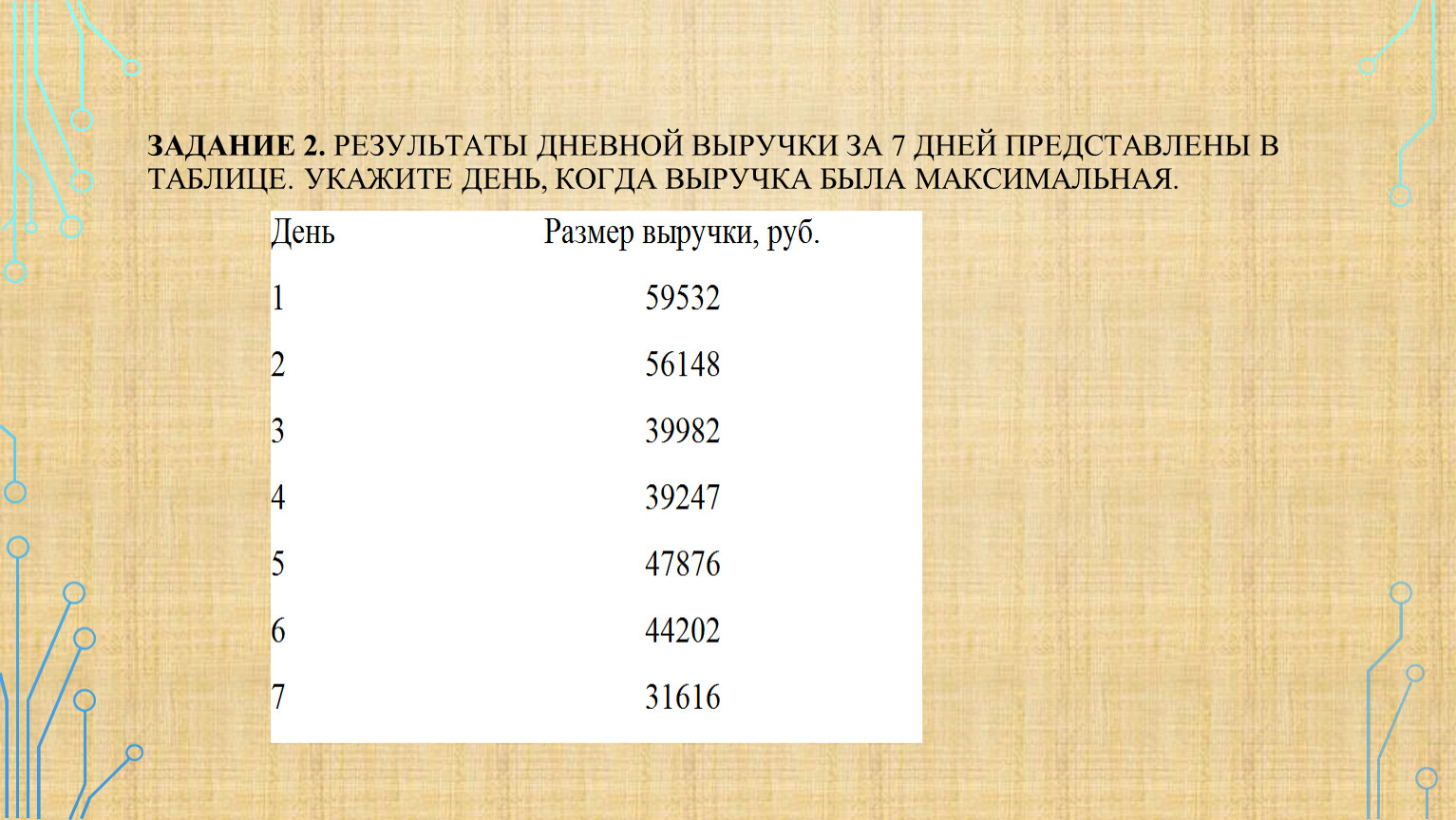 Задание 2. Результаты дневной выручки за 7 дней представлены в таблице. Укажите день, когда выручка была максимальная.