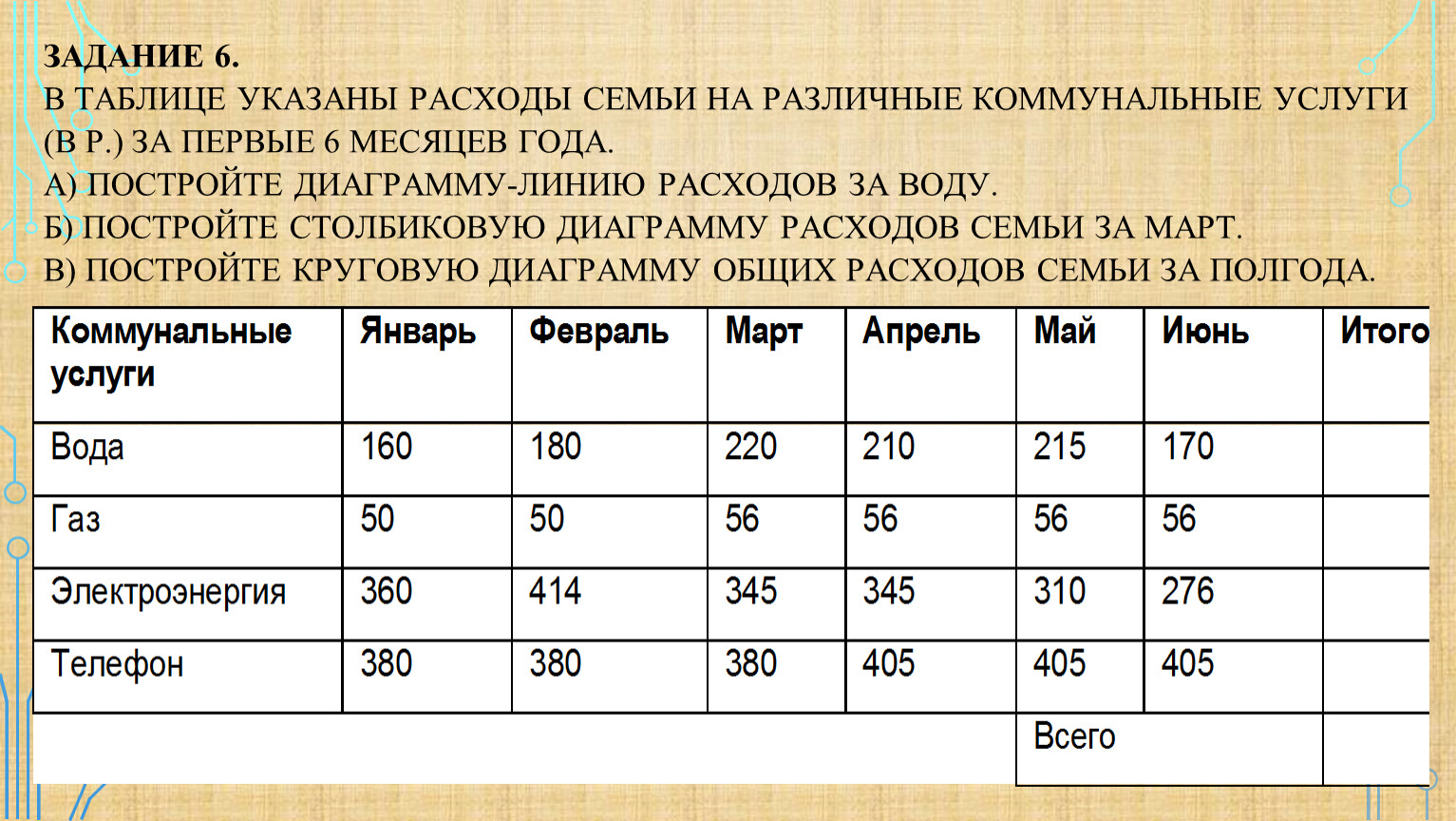 Задание 6.В таблице указаны расходы семьи на различные коммунальные услуги (в р.) за первые 6 месяцев года.а) Постройте диаграмму-линию расходов за воду.б) Постройте столбиковую диаграмму расходов семьи за март.в) Постройте круговую диаграмму общих расходов семьи за полгода.
