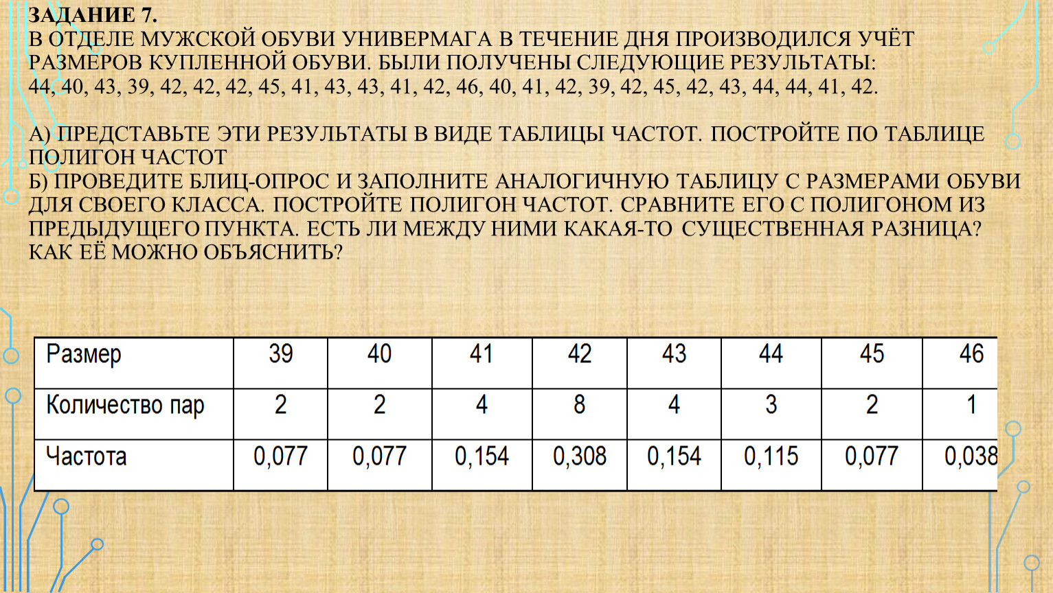 Задание 7.В отделе мужской обуви универмага в течение дня производился учёт размеров купленной обуви. Были получены следующие результаты:44, 40, 43, 39, 42, 42, 42, 45, 41, 43, 43, 41, 42, 46, 40, 41, 42, 39, 42, 45, 42, 43, 44, 44, 41, 42.а) Представьте эти результаты в виде таблицы частот. Постройте по таблице полигон частотб) Проведите блиц-опрос и заполните аналогичную таблицу с размерами обуви для своего класса. Постройте полигон частот. Сравните его с полигоном из предыдущего пункта. Есть ли между ними какая-то существенная разница? Как её можно объяснить?