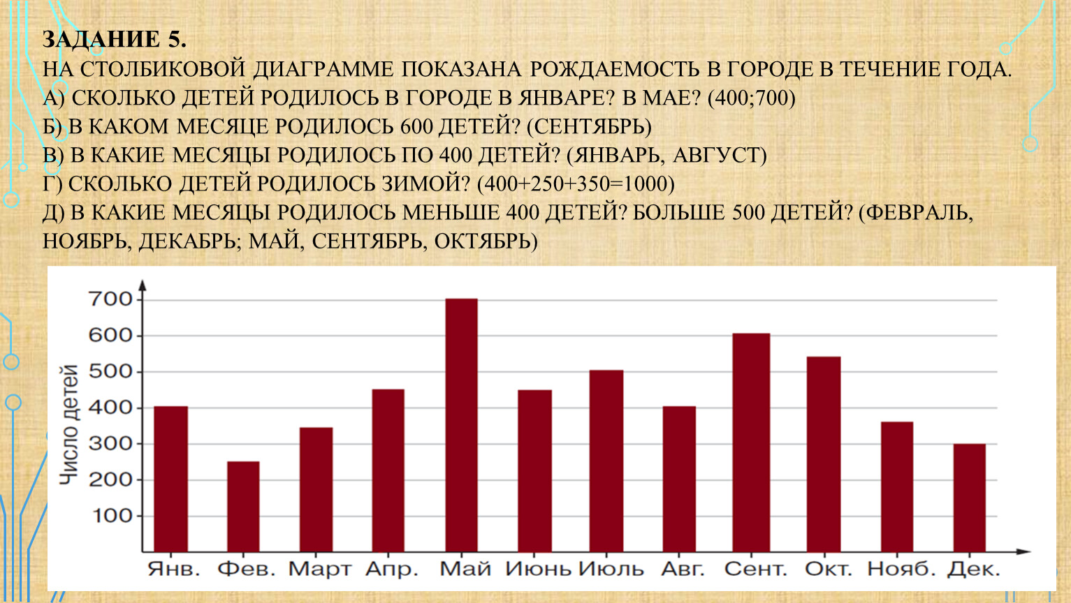 Задание 5.На столбиковой диаграмме показана рождаемость в городе в течение года. а) Сколько детей родилось в городе в январе? в мае? (400;700)б) В каком месяце родилось 600 детей? (сентябрь)в) В какие месяцы родилось по 400 детей? (январь, август)г) Сколько детей родилось зимой? (400+250+350=1000)д) В какие месяцы родилось меньше 400 детей? больше 500 детей? (февраль, ноябрь, декабрь; май, сентябрь, октябрь)