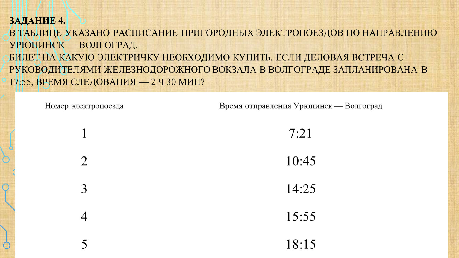 Задание 4.В таблице указано расписание пригородных электропоездов по направлению Урюпинск — Волгоград.Билет на какую электричку необходимо купить, если деловая встреча с руководителями железнодорожного вокзала в Волгограде запланирована в 17:55, время следования — 2 ч 30 мин?