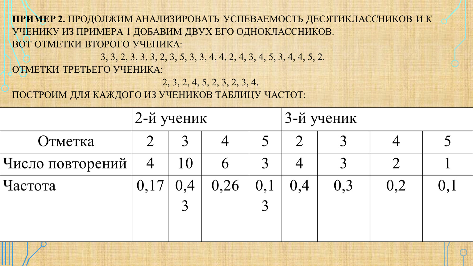 Пример 2. Продолжим анализировать успеваемость десятиклассников и к ученику из примера 1 добавим двух его одноклассников.Вот отметки второго ученика: 3, 3, 2, 3, 3, 3, 2, 3, 5, 3, 3, 4, 4, 2, 4, 3, 4, 5, 3, 4, 4, 5, 2.Отметки третьего ученика: 2, 3, 2, 4, 5, 2, 3, 2, 3, 4.Построим для каждого из учеников таблицу частот: