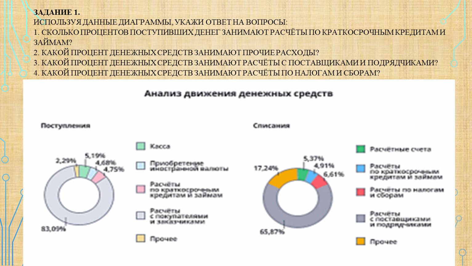 Задание 1.Используя данные диаграммы, укажи ответ на вопросы:1. Сколько процентов поступивших денег занимают расчёты по краткосрочным кредитам и займам?2. Какой процент денежных средств занимают прочие расходы?3. Какой процент денежных средств занимают расчёты с поставщиками и подрядчиками?4. Какой процент денежных средств занимают расчёты по налогам и сборам?