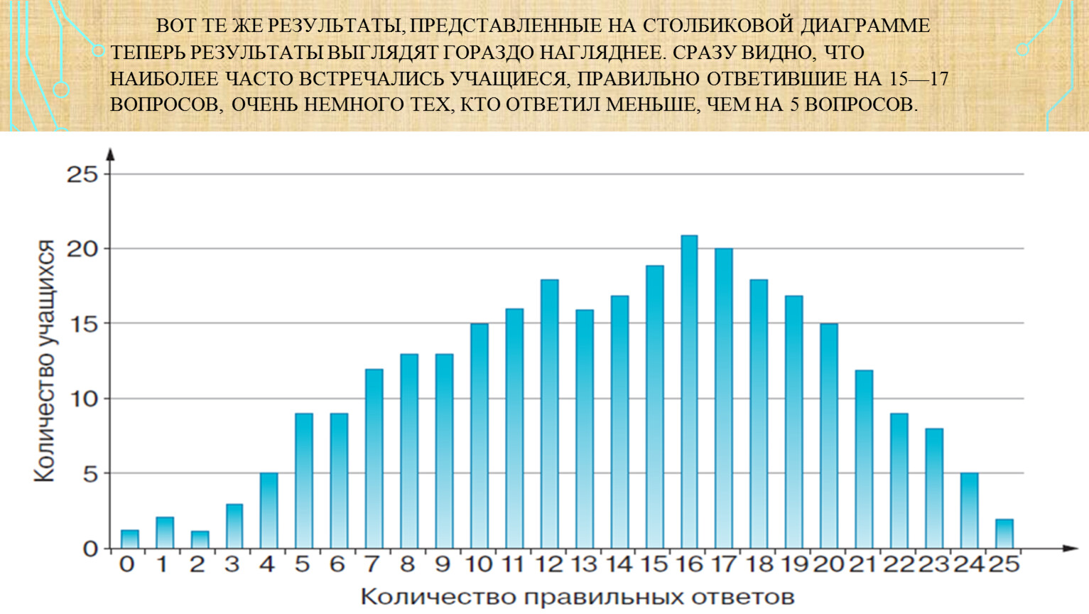 Вот те же результаты, представленные на столбиковой диаграммеТеперь результаты выглядят гораздо нагляднее. Сразу видно, что наиболее часто встречались учащиеся, правильно ответившие на 15—17 вопросов, очень немного тех, кто ответил меньше, чем на 5 вопросов.