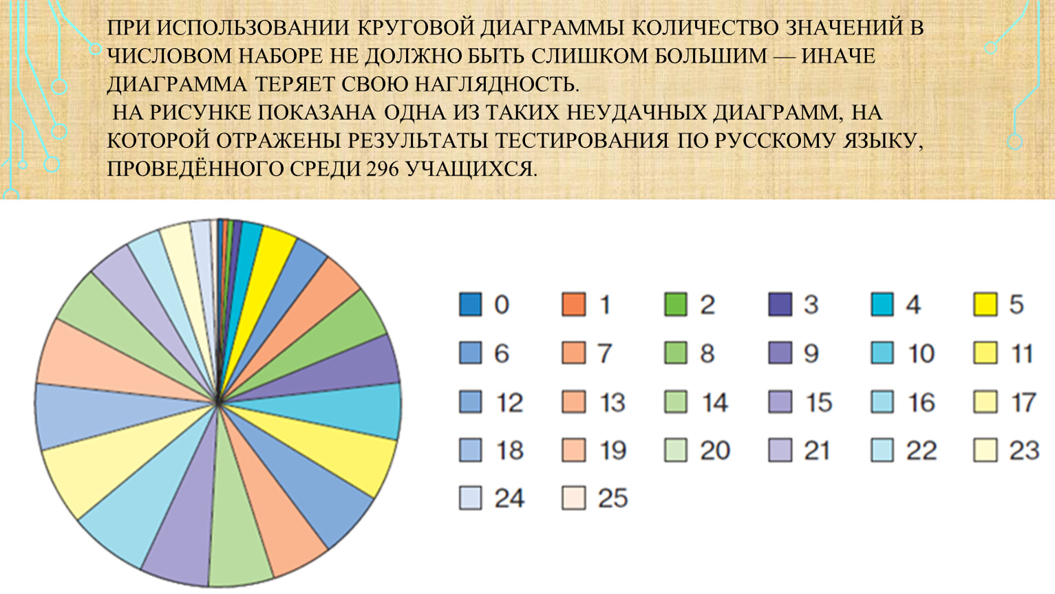 при использовании круговой диаграммы количество значений в числовом наборе не должно быть слишком большим — иначе диаграмма теряет свою наглядность. На рисунке показана одна из таких неудачных диаграмм, на которой отражены результаты тестирования по русскому языку, проведённого среди 296 учащихся.