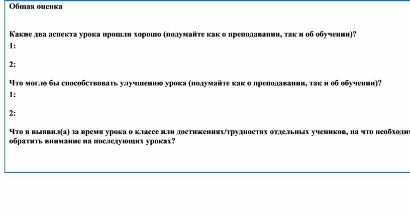 Какие два аспекта урока прошли хорошо (подумайте как о преподавании, так и об обучении)? 1: