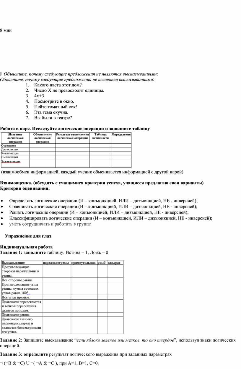 Взаимооценка. (обсудить с учащимися критерии успеха, учащиеся предлагаю свои варианты) Критерии оценивания: · Определять логические операции (И – конъюнкцией, ИЛИ – дизъюнкцией, НЕ - инверсией); · Сравнивать логические операции (И – конъюнкцией, ИЛИ – дизъюнкцией, НЕ - инверсией); · Решать логические операции (И – конъюнкцией, ИЛИ – дизъюнкцией, НЕ - инверсией); · Классифицировать логические операции (И – конъюнкцией, ИЛИ – дизъюнкцией, НЕ - инверсией); · уметь сотрудничать и работать в группе Упражнение для глаз