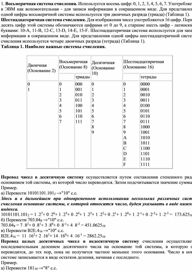 1. Восьмеричная система счисления. Используется восемь цифр: 0, 1, 2, 3, 4, 5, 6, 7. Употребляется в ЭВМ как вспомогательная - для записи информации в сокращенном виде. Для представления одной цифры восьмеричной системы используется три двоичных разряда (триада) (Таблица 1). Шестнадцатеричная система счисления. Для изображения чисел употребляются 16 цифр. Первые десять цифр этой системы обозначаются цифрами от 0 до 9, а старшие шесть цифр - латинскими буквами: 10-A, 11-B, 12-C, 13-D, 14-E, 15-F. Шестнадцатеричная система используется для записи информации в сокращенном виде. Для представления одной цифры шестнадцатеричной системы счисления используется четыре двоичных разряда (тетрада) (Таблица 1). Таблица 1. Наиболее важные системы счисления.