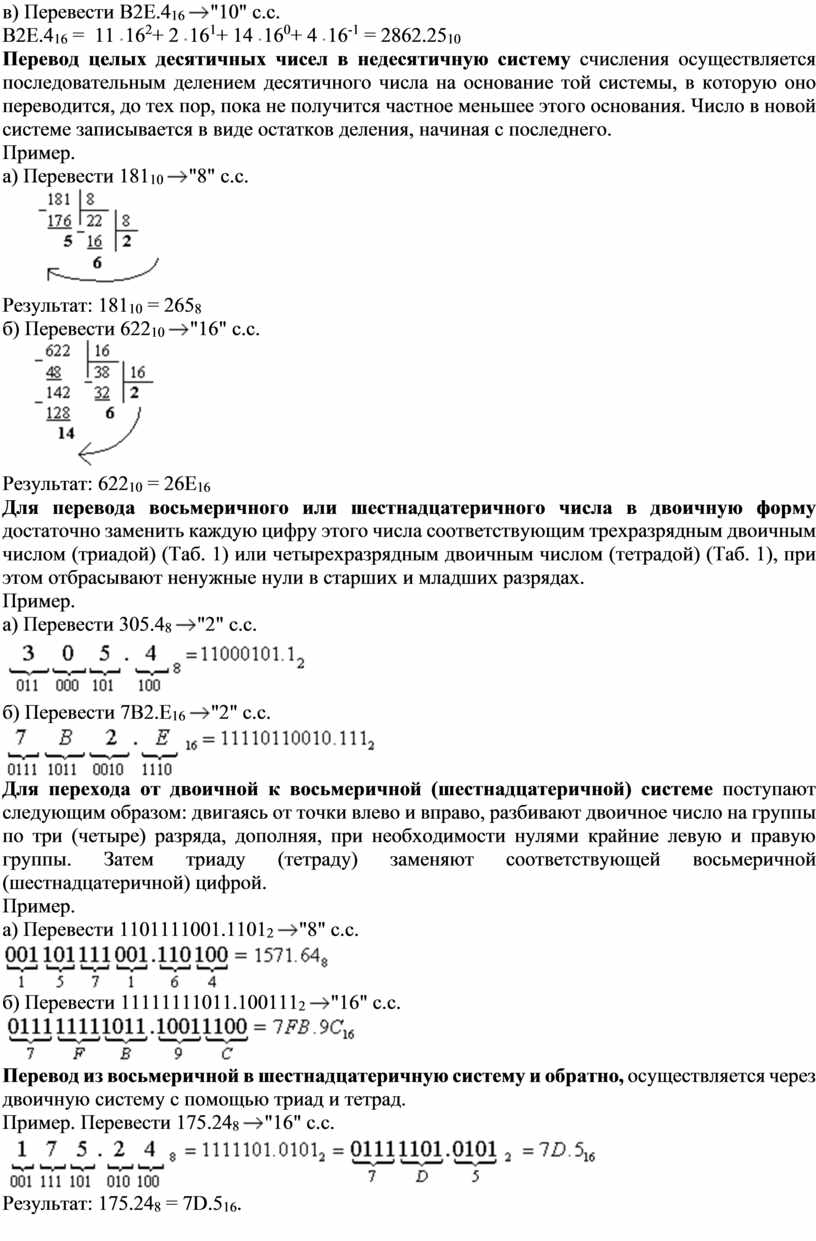 Перевод чисел в десятичную систему осуществляется путем составления степенного ряда с основанием той системы, из которой число переводится. Затем подсчитывается значение суммы. Пример. а) Перевести 10101101.1012 Здесь и в дальнейшем при одновременном использовании нескольких различных систем счисления основание системы, к которой относится число, будем указывать в виде нижнего индекса. 10101101.1012 = 1 б) Перевести 703.048 703.048 = 7 в) Перевести B2E.416 B2E.416 = 11 Перевод целых десятичных чисел в недесятичную систему счисления осуществляется последовательным делением десятичного числа на основание той системы, в которую оно переводится, до тех пор, пока не получится частное меньшее этого основания. Число в новой системе записывается в виде остатков деления, начиная с последнего. Пример. а) Перевести 18110 Результат: 18110 = 2658 б) Перевести 62210 Результат: 62210 = 26E16 Для перевода восьмеричного или шестнадцатеричного числа в двоичную форму достаточно заменить каждую цифру этого числа соответствующим трехразрядным двоичным числом (триадой) (Таб. 1) или четырехразрядным двоичным числом (тетрадой) (Таб. 1), при этом отбрасывают ненужные нули в старших и младших разрядах. Пример. а) Перевести 305.48