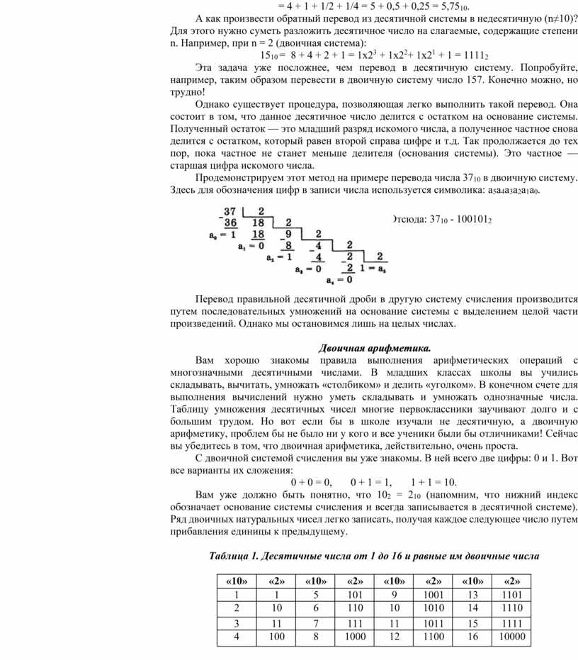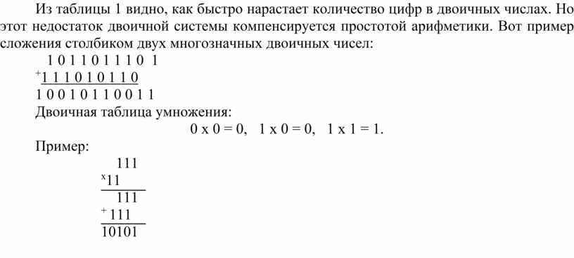 Из таблицы 1 видно, как быстро нарастает количество цифр в двоичных числах. Но этот недостаток двоичной системы компенсируется простотой арифметики. Вот пример сложения столбиком двух многозначных двоичных чисел: