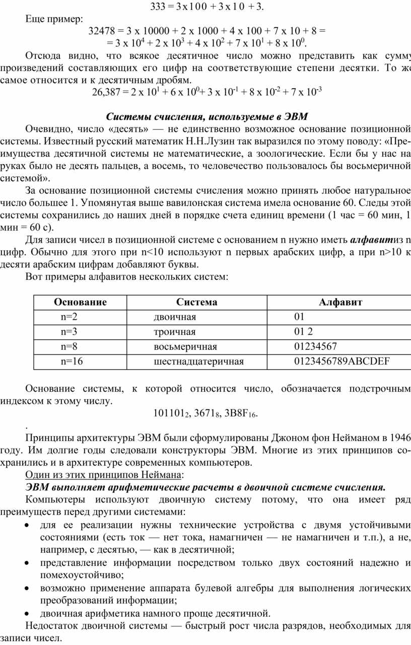 Числа в этих системах читаются почти так же легко, как десятичные, требуют соответственно в три (восьмеричная) и в четыре (шестнадцатеричная) раза меньше разрядов, чем в двоичной системе (ведь числа 8 и 16 – соответственно, третья и четвертая степени числа 2).