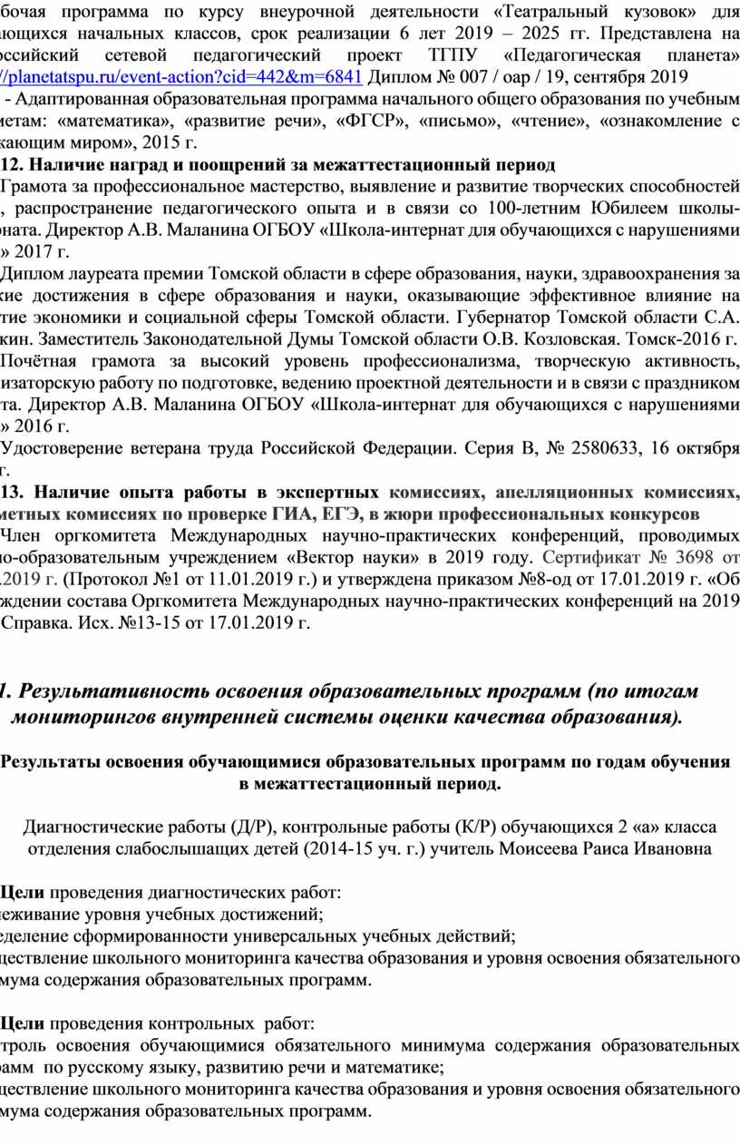 - Рабочая программа по курсу внеурочной деятельности «Театральный кузовок» для обучающихся начальных классов, срок реализации 6 лет 2019 – 2025 гг. Представлена на Всероссийский сетевой педагогический проект ТГПУ «Педагогическая планета» https://planetatspu.ru/event-action?cid=442&m=6841 Диплом № 007 / оар / 19, сентября 2019