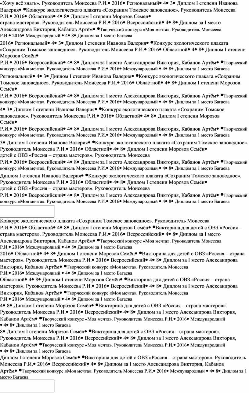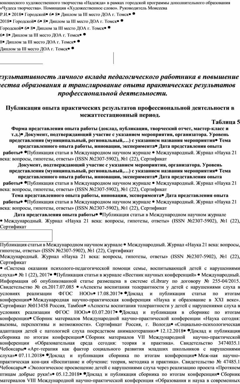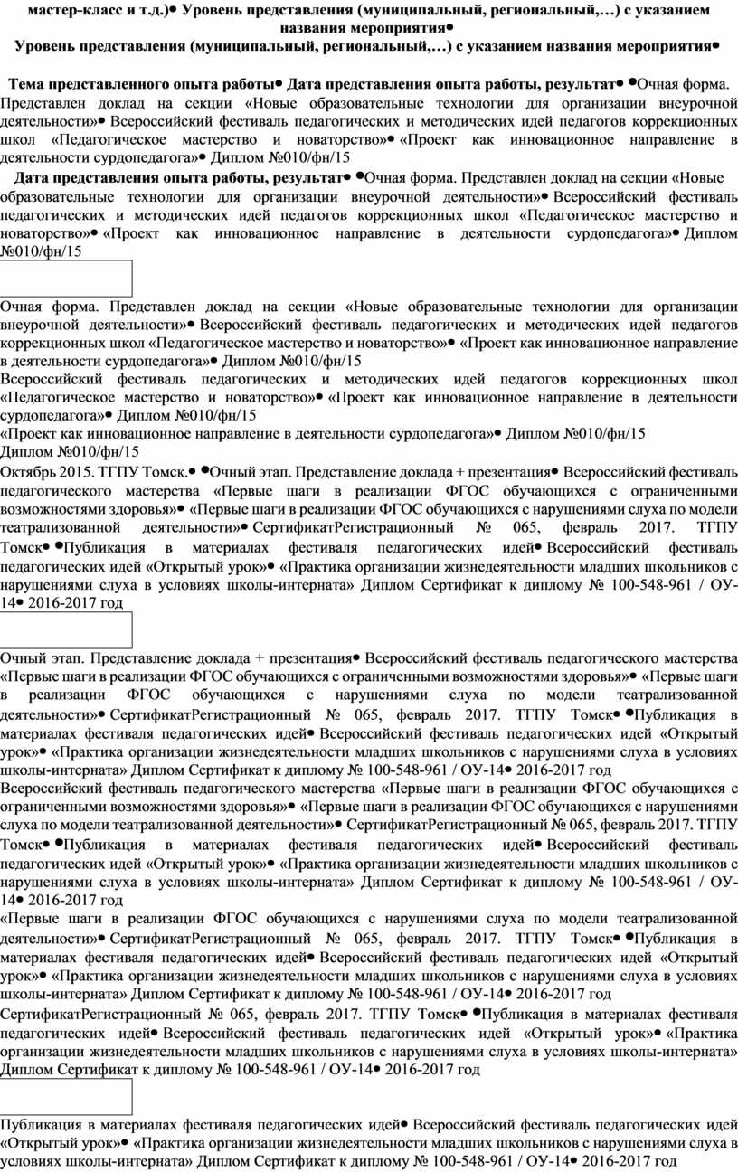 - Программа внеурочной деятельности ФГОС НОО ОВЗ 1-4 классы по коррекции психомоторики и сенсорных процессов у младших школьников с нарушениями слуха, имеющих задержку психического развития «ЗНАЮ, УМЕЮ, МОГУ», 2017 г. (отмечена Дипломом I степени ТОИПКРО);