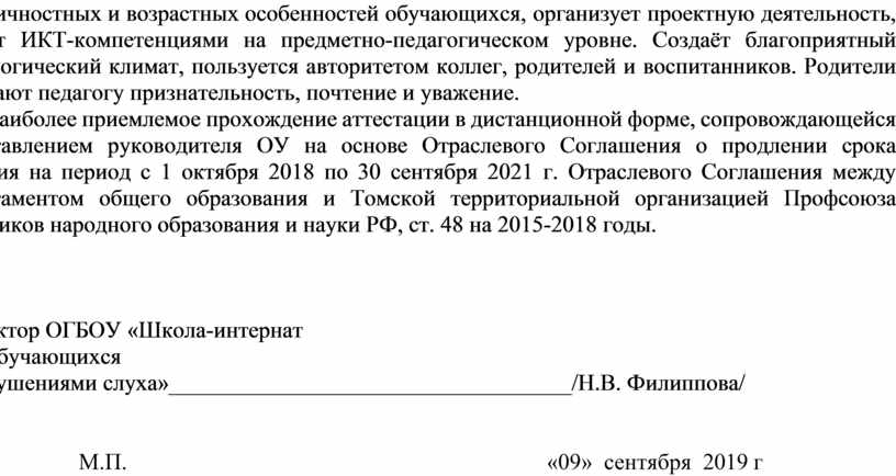 Наиболее приемлемое прохождение аттестации в дистанционной форме, сопровождающейся Представлением руководителя ОУ на основе Отраслевого Соглашения о продлении срока действия на период с 1 октября 2018 по 30 сентября 2021 г. Отраслевого Соглашения между Департаментом общего образования и Томской территориальной организацией Профсоюза работников народного образования и науки РФ, ст. 48 на 2015-2018 годы.