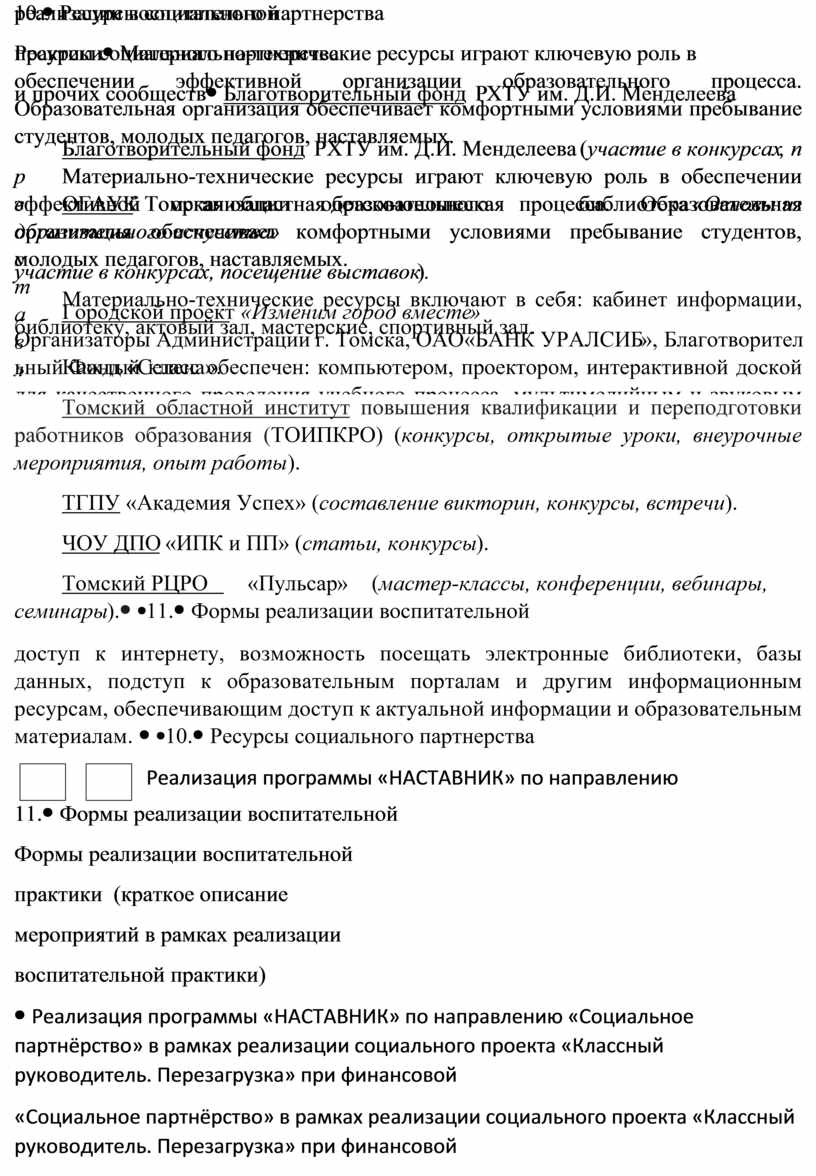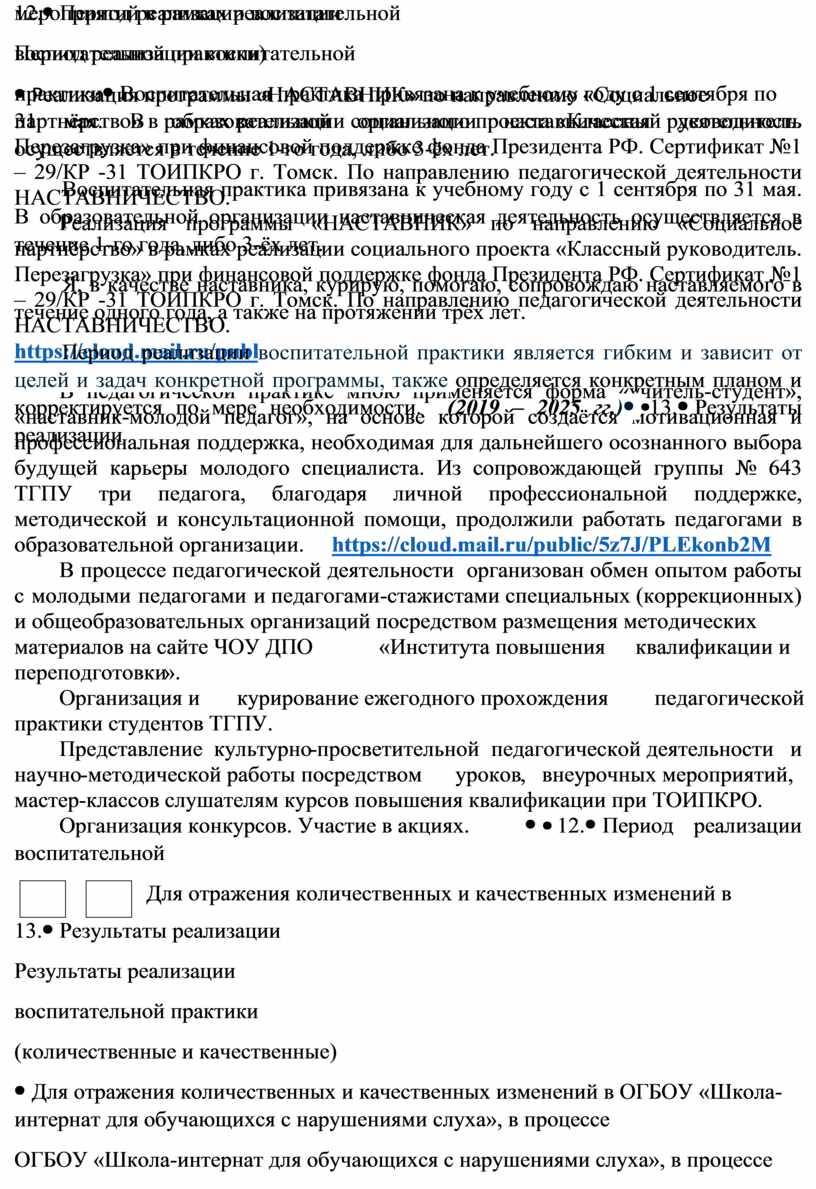 Реализация программы «НАСТАВНИК» по направлению «Социальное партнёрство» в рамках реализации социального проекта «Классный руководитель. Перезагрузка» при финансовой поддержке фонда Президента РФ. Сертификат №1 – 29/КР -31 ТОИПКРО г. Томск. По направлению педагогической деятельности НАСТАВНИЧЕСТВО.https://cloud.mail.ru/public/WEdv/Y8urHvPTV В педагогической практике мною применяется форма «учитель-студент», «наставник-молодой педагог», на основе которой создаётся мотивационная и профессиональная поддержка, необходимая для дальнейшего осознанного выбора будущей карьеры молодого специалиста. Из сопровождающей группы № 643 ТГПУ три педагога, благодаря личной профессиональной поддержке, методической и консультационной помощи, продолжили работать педагогами в образовательной организации. https://cloud.mail.ru/public/5z7J/PLEkonb2MВ процессе педагогической деятельности организован обмен опытом работы с молодыми педагогами и педагогами-стажистами специальных (коррекционных) и общеобразовательных организаций посредством размещения методических материалов на сайте ЧОУ ДПО «Института повышения квалификации и переподготовки».Организация и курирование ежегодного прохождения педагогической практики студентов ТГПУ.Представление культурно-просветительной педагогической деятельности и научно-методической работы посредством уроков, внеурочных мероприятий, мастер-классов слушателям курсов повышения квалификации при ТОИПКРО.Организация конкурсов. Участие в акциях. |