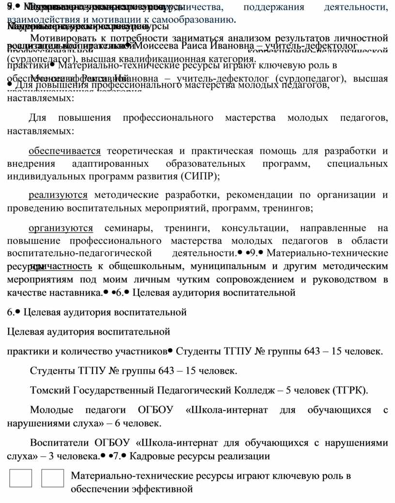 Моисеева Раиса Ивановна – учитель-дефектолог (сурдопедагог), высшая квалификационная категория. Кадровые ресурсы реализации воспитательной практики составляют: методические объединения учителей начальных классов, директор, учителя, воспитатели, педагоги дополнительного образования, психологи, социальные педагоги, родители. |