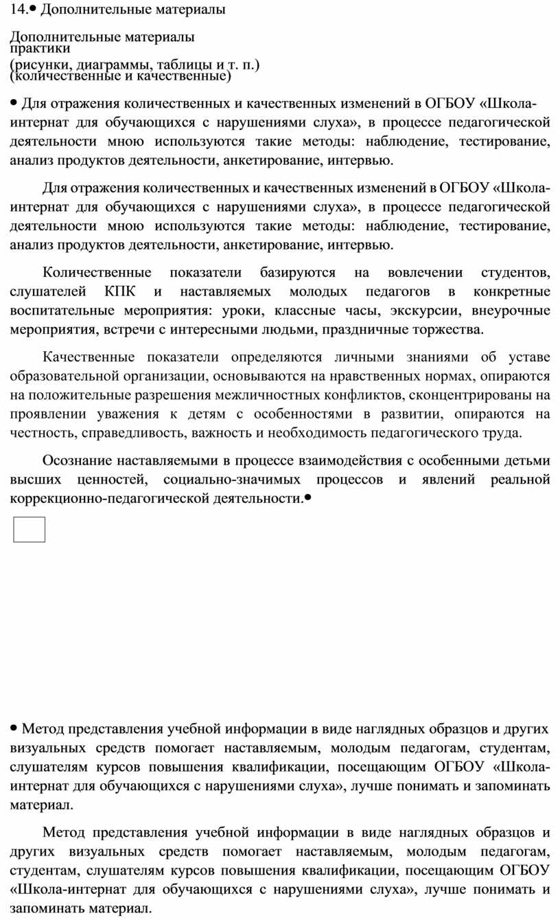 Для отражения количественных и качественных изменений в ОГБОУ «Школа-интернат для обучающихся с нарушениями слуха», в процессе педагогической деятельности мною используются такие методы: наблюдение, тестирование, анализ продуктов деятельности, анкетирование, интервью. Количественные показатели базируются на вовлечении студентов, слушателей КПК и наставляемых молодых педагогов в конкретные воспитательные мероприятия: уроки, классные часы, экскурсии, внеурочные мероприятия, встречи с интересными людьми, праздничные торжества. Качественные показатели определяются личными знаниями об уставе образовательной организации, основываются на нравственных нормах, опираются на положительные разрешения межличностных конфликтов, сконцентрированы на проявлении уважения к детям с особенностями в развитии, опираются на честность, справедливость, важность и необходимость педагогического труда. Осознание наставляемыми в процессе взаимодействия с особенными детьми высших ценностей, социально-значимых процессов и явлений реальной коррекционно-педагогической деятельности. |
