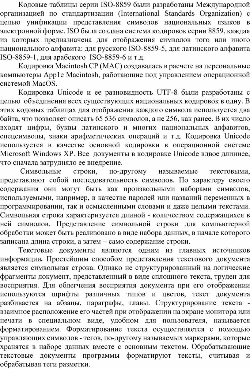 Кодировка Unicode и ее разновидность UTF-8 были разработаны с целью объединения всех существующих национальных кодировок в одну. В этих кодовых таблицах для отображения каждого символа используется два байта, что позволяет описать 65 536 символов, а не 256, как ранее. В их число входят цифры, буквы латинского и многих национальных алфавитов, спецсимволы, знаки арифметических операций и т.д. Кодировка Unicode используется в качестве основной кодировки в операционной системе Microsoft Windows ХР. Все документы в кодировке Unicode вдвое длиннее, что сначала затрудняло ее внедрение.