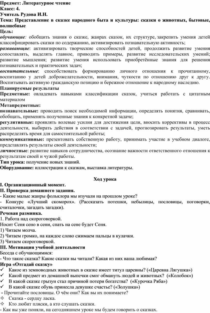 Предметные: овладевать навыками классификации сказок, учиться работать с цитатным материалом
