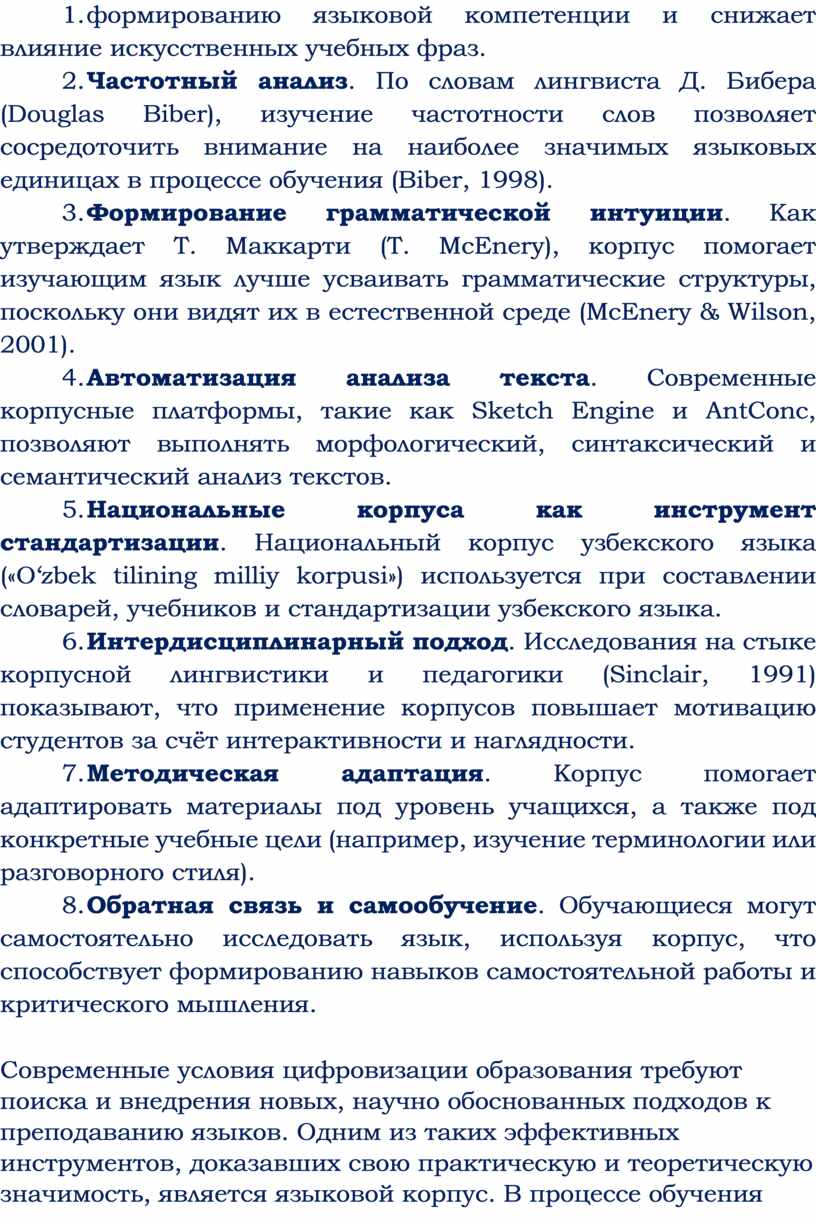 Современные исследования (Biber, 1998; McEnery & Wilson, 2001; Sinclair, 1991) подчёркивают, что обучение, основанное на корпусных данных, повышает мотивацию студентов, развивает критическое мышление и улучшает усвоение материала благодаря интерактивной и наглядной природе анализа. Это особенно важно при обучении узбекскому языку как родному, второму или иностранному, поскольку данный язык имеет богатую морфологию, сложную систему словообразования и активную стилистическую вариативность.