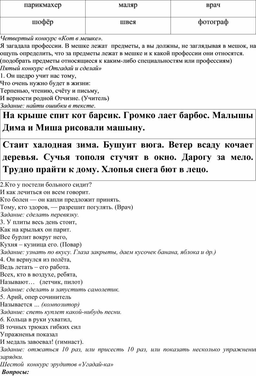 закрыты, даем кусочек банана, яблока и др.) Задание: сделать и запустить самолетик. 5. Арий, опер сочинитель Называется … (композитор) Задание: спеть куплет какой-нибудь песни. 6. Кольца в руки ухватил, Задание: