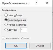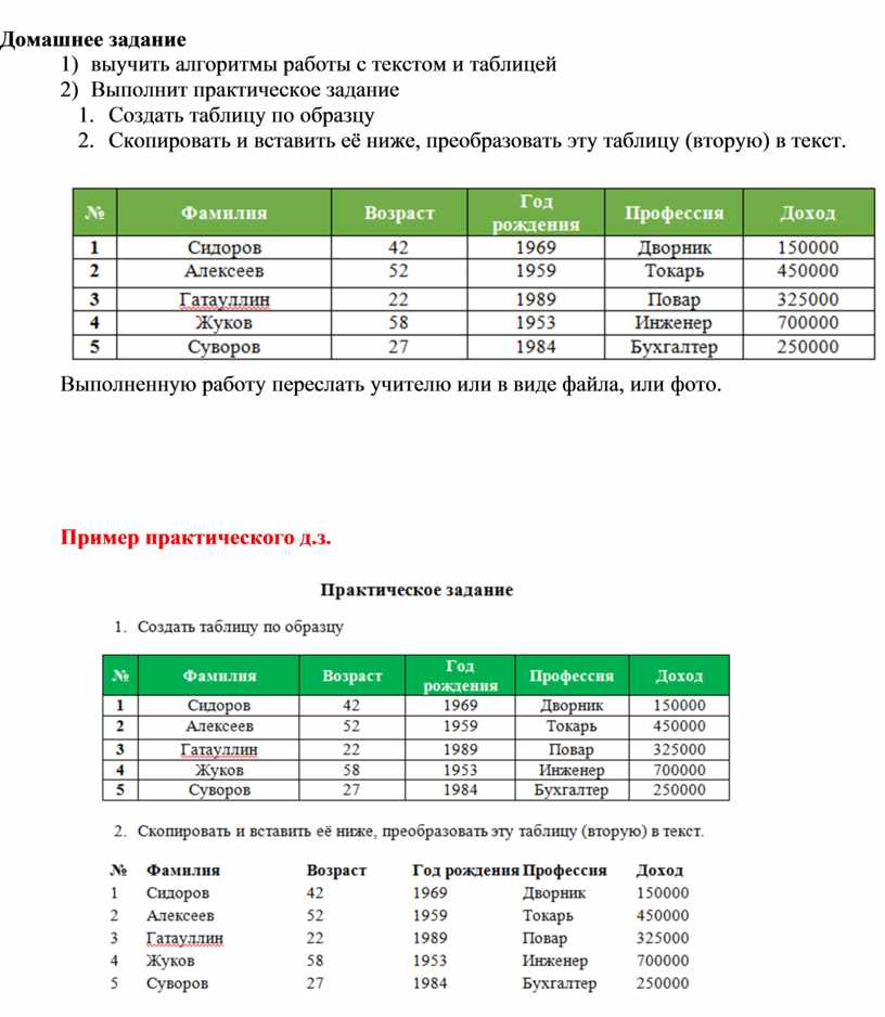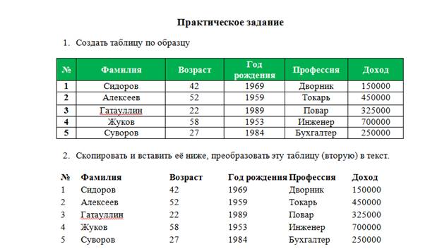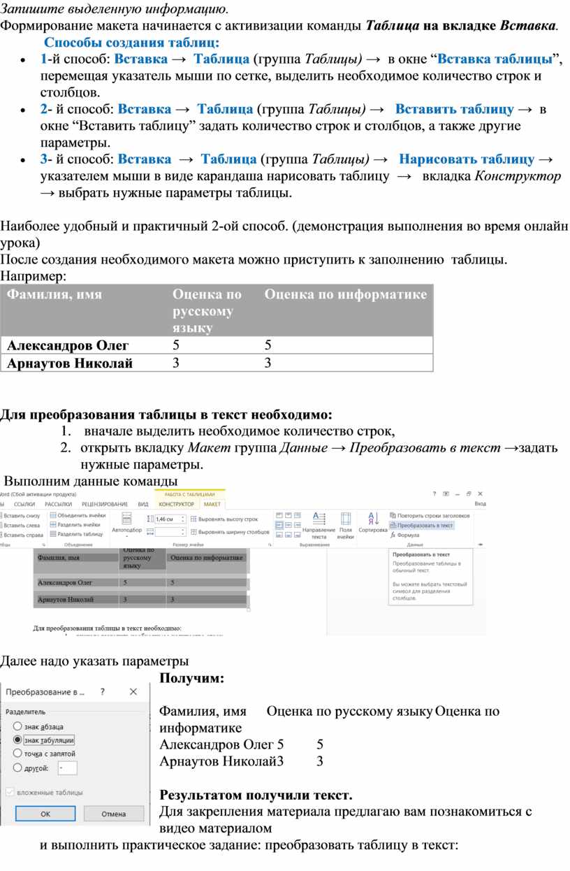 и выполнить практическое задание: преобразовать таблицу в текст: